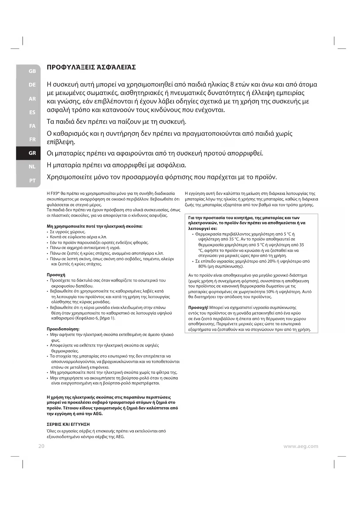 - Μην επιχειρήσετε να ακουμπήσετε τη βούρτσα-ρολό όταν η σκούπα είναι ενεργοποιημένη και η βούρτσα-ρολό περιστρέφεται. Η χρήση της ηλεκτρικής σκούπας στις παραπάνω περιπτώσεις μπορεί να προκαλέσει σοβαρό τραυματισμό ατόμων ή ζημιά στο προϊόν. Τέτοιου είδους τραυματισμός ή ζημιά δεν καλύπτεται από την εγγύηση ή από την AEG. ΣΕΡΒΙΣ ΚΆΙ ΕΓΓΥΗΣΗ Όλες οι εργασίες σέρβις ή επισκευής πρέπει να εκτελούνται από εξουσιοδοτημένο κέντρο σέρβις της AEG.PT