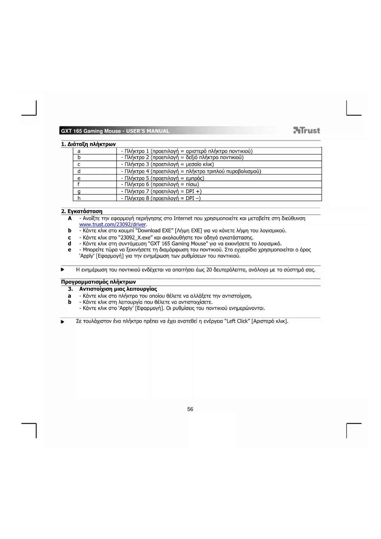 - Ανοίξτε την εφαρμογή περιήγησης στο Internet που χρησιμοποιείτε και μεταβείτε στη διεύθυνση www.trust.com/23092/driver. - Κάντε κλικ στο κουμπί “Download EXE” [Λήψη EXE] για να κάνετε λήψη του λογισμικού. - Κάντε κλικ στο “23092_X.exe” και ακολουθήστε τον οδηγό εγκατάστασης. - Κάντε κλικ στη συντόμευση “GXT 165 Gaming Mouse” για να εκκινήσετε το λογισμικό. - Μπορείτε τώρα να ξεκινήσετε τη διαμόρφωση του ποντικιού. Στο εγχειρίδιο χρησιμοποιείται ο όρος ‘Apply’ [Εφαρμογή] για την ενημέρωση των ρυθμίσεων του ποντικιού. Η ενημέρωση του ποντικιού ενδέχεται να απαιτήσει έως 20 δευτερόλεπτα, ανάλογα με το σύστημά σας. Προγραμματισμός πλήκτρων