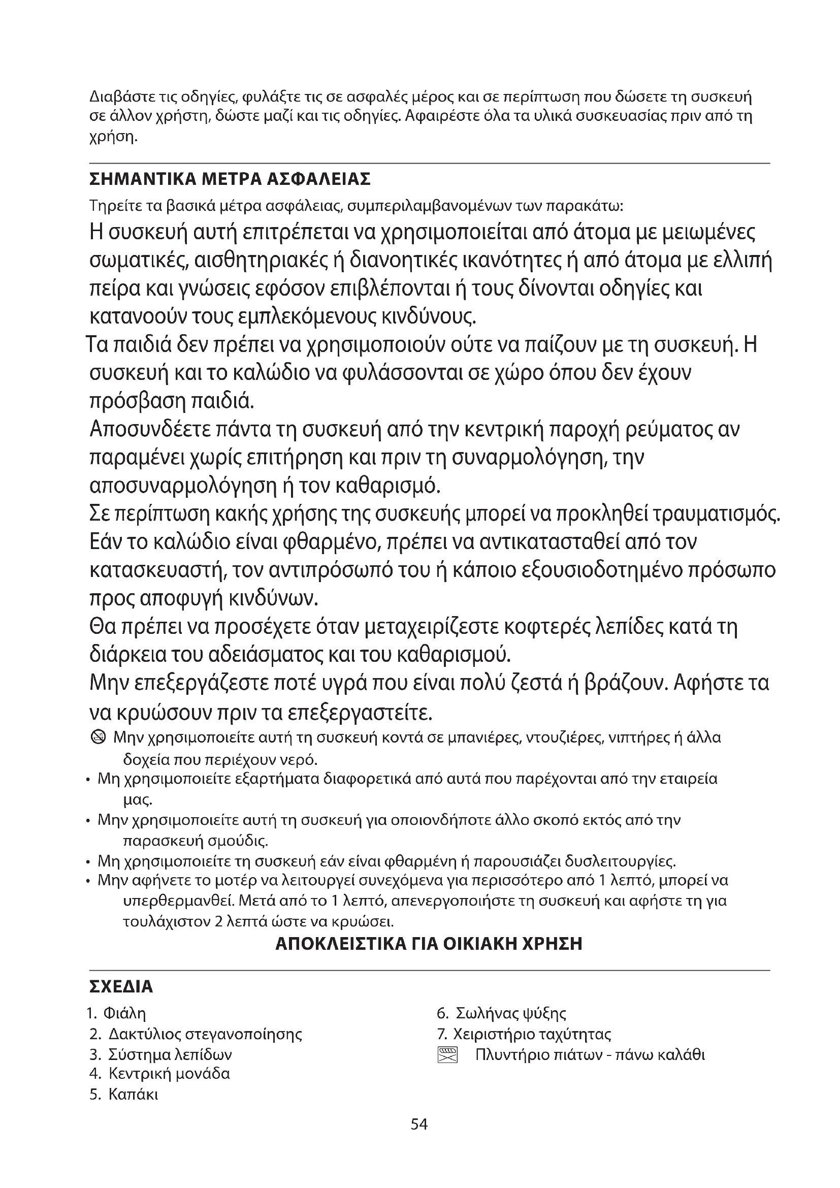 ΣΗΜΑΝΤΙΚΑ ΜΕΤΡΑ ΑΣΦΑΛΕΙΑΣ Τηρείτε τα βασικά μέτρα ασφάλειας, συμπεριλαμβανομένων των παρακάτω: Η συσκευή αυτή επιτρέπεται να χρησιμοποιείται από άτομα με μειωμένες σωματικές, αισθητηριακές ή διανοητικές ικανότητες ή από άτομα με ελλιπή πείρα και γνώσεις εφόσον επιβλέπονται ή τους δίνονται οδηγίες και κατανοούν τους εμπλεκόμενους κινδύνους. Τα παιδιά δεν πρέπει να χρησιμοποιούν ούτε να παίζουν με τη συσκευή. Η συσκευή και το καλώδιο να φυλάσσονται σε χώρο όπου δεν έχουν πρόσβαση παιδιά. Αποσυνδέετε πάντα τη συσκευή από την κεντρική παροχή ρεύματος αν παραμένει χωρίς επιτήρηση και πριν τη συναρμολόγηση, την αποσυναρμολόγηση ή τον καθαρισμό. Σε περίπτωση κακής χρήσης της συσκευής μπορεί να προκληθεί τραυματισμός. Εάν το καλώδιο είναι φθαρμένο, πρέπει να αντικατασταθεί από τον κατασκευαστή, τον αντιπρόσωπό του ή κάποιο εξουσιοδοτημένο πρόσωπο προς αποφυγή κινδύνων. Θα πρέπει να προσέχετε όταν μεταχειρίζεστε κοφτερές λεπίδες κατά τη διάρκεια του αδειάσματος και του καθαρισμού. Μην επεξεργάζεστε ποτέ υγρά που είναι πολύ ζεστά ή βράζουν. Αφήστε τα να κρυώσουν πριν τα επεξεργαστείτε. b Μην χρησιμοποιείτε αυτή τη συσκευή κοντά σε μπανιέρες, ντουζιέρες, νιπτήρες ή άλλα δοχεία που περιέχουν νερό.