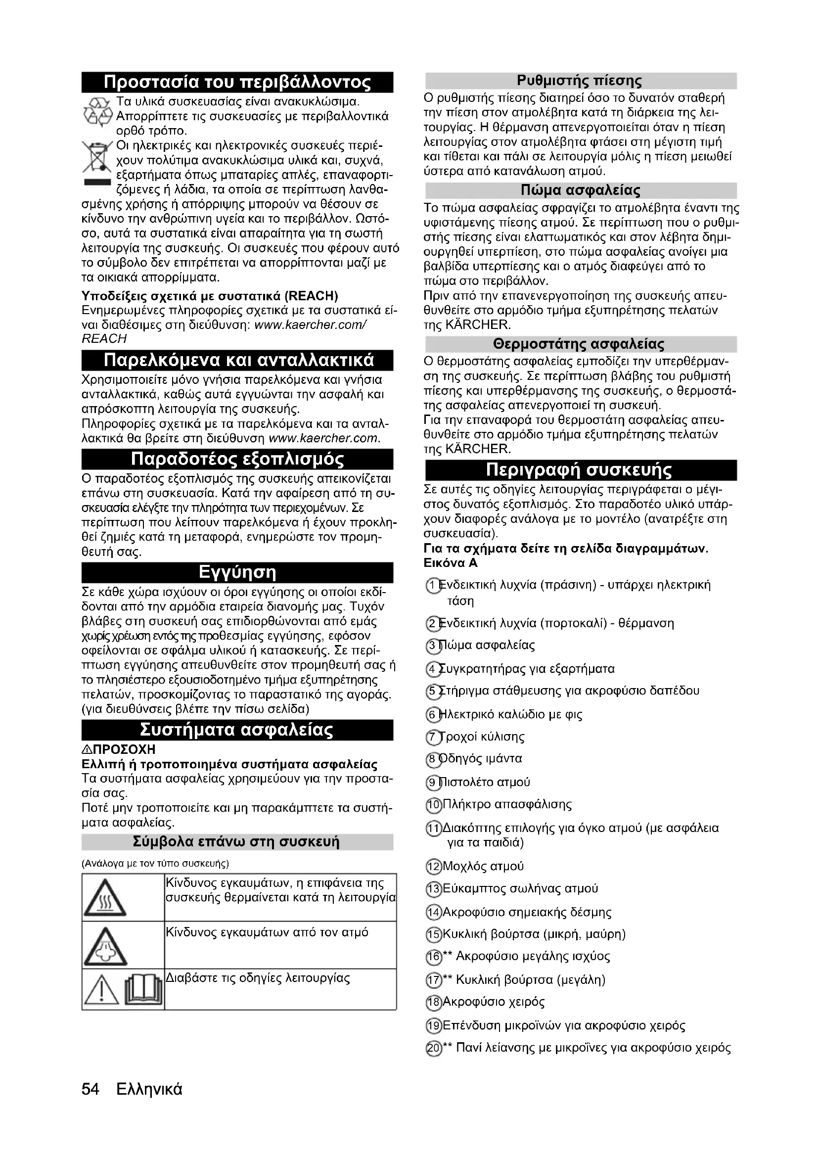 Ποτέ μην τροποποιείτε και μη παρακάμπτετε τα συστή- ματα ασφαλείας. Σύμβολα επάνω στη συσκευή (Ανάλογα με τον τύπο συσκευής) Ρυθμιστής πίεσης Ο ρυθμιστής πίεσης διατηρεί όσο το δυνατόν σταθερή την πίεση στον ατμολέβητα κατά τη διάρκεια της λει- τουργίας. Η θέρμανση απενεργοποιείται όταν η πίεση λειτουργίας στον ατμολέβητα φτάσει στη μέγιστη τιμή και τίθεται και πάλι σε λειτουργία μόλις η πίεση μειωθεί ύστερα από κατανάλωση ατμού. Πώμα ασφαλείας Το πώμα ασφαλείας σφραγίζει το ατμολέβητα έναντι της υφιστάμενης πίεσης ατμού. Σε περίπτωση που ο ρυθμι- στής πίεσης είναι ελαττωματικός και στον λέβητα δημι- ουργηθεί υπερπίεση, στο πώμα ασφαλείας ανοίγει μια βαλβίδα υπερπίεσης και ο ατμός διαφεύγει από το πώμα στο περιβάλλον. Πριν από την επανενεργοποίηση της συσκευής απευ- θυνθείτε στο αρμόδιο τμήμα εξυπηρέτησης πελατών της KÄRCHER. Θερμοστάτης ασφαλείας Ο θερμοστάτης ασφαλείας εμποδίζει την υπερθέρμαν- ση της συσκευής. Σε περίπτωση βλάβης του ρυθμιστή πίεσης και υπερθέρμανσης της συσκευής, ο θερμοστά- της ασφαλείας απενεργοποιεί τη συσκευή. Για την επαναφορά του θερμοστάτη ασφαλείας απευ- θυνθείτε στο αρμόδιο τμήμα εξυπηρέτησης πελατών της KÄRCHER. Περιγραφή συσκευής Σε αυτές τις οδηγίες λειτουργίας περιγράφεται ο μέγι- στος δυνατός εξοπλισμός. Στο παραδοτέο υλικό υπάρ- χουν διαφορές ανάλογα με το μοντέλο (ανατρέξτε στη συσκευασία). Για τα σχήματα δείτε τη σελίδα διαγραμμάτων. Εικόνα A 1 Ενδεικτική λυχνία (πράσινη) - υπάρχει ηλεκτρική