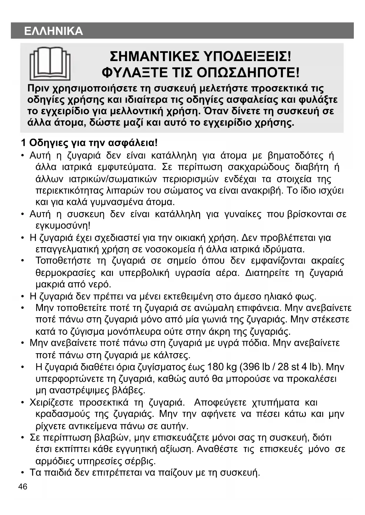 - Η ζυγαριά έχει σχεδιαστεί για την οικιακή χρήση. Δεν προβλέπεται για επαγγελματική χρήση σε νοσοκομεία ή άλλα ιατρικά ιδρύματα.