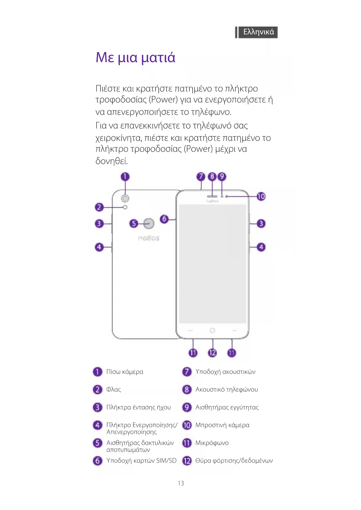 Πιέστε και κρατήστε πατημένο το πλήκτρο τροφοδοσίας (Power) για να ενεργοποιήσετε ή να απενεργοποιήσετε το τηλέφωνο. Για να επανεκκινήσετε το τηλέφωνό σας χειροκίνητα, πιέστε και κρατήστε πατημένο το πλήκτρο τροφοδοσίας (Power) μέχρι να