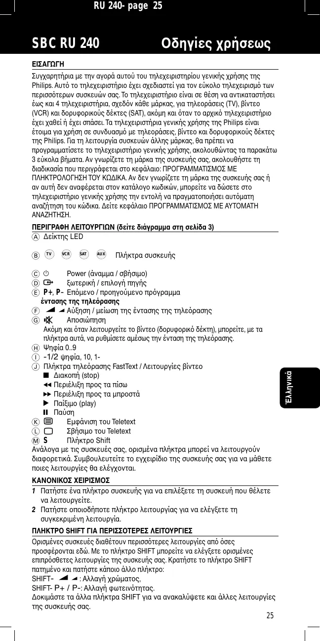 C y Power (άναµµα / σβήσιµο) D † ξωτερική / επιλογή πηγής E P+, P- Επ)µενο / προηγούµενο πρ)γραµµα έντασης της τηλε)ρασης Αύξηση / µείωση της έντασης της τηλε)ρασης Αποσιώπηση Ακ)µη και )ταν λειτουργείτε το βίντεο (δορυφορικ) δέκτη), µπορείτε, µε τα πλήκτρα αυτά, να ρυθµίσετε αµέσως την ένταση της τηλε)ρασης. H Ψηφία 0..9 I -1/2 ψηφία, 10, 1J Πλήκτρα τηλε)ρασης FastText / Λειτουργίες βίντεο 9 ∆ιακοπή (stop) 5 Περιέλιξη προς τα πίσω 6 Περιέλιξη προς τα µπροστά 2 Παίξιµο (play) ; Παύση K b Εµφάνιση του Teletext L I Σβήσιµο του Teletext M S Πλήκτρο Shift Ανάλογα µε τις συσκευές σας, ορισµένα πλήκτρα µπορεί να λειτουργούν διαφορετικά. Συµβουλευτείτε το εγχειρίδιο της συσκευής σας για να µάθετε ποιες λειτουργίες θα ελέγχονται. ΚΑΝΟΝIΚΟΣ ΧΕIΡIΣΜΟΣ 1 Πατήστε ένα πλήκτρο συσκευής για να επιλέξετε τη συσκευή που θέλετε να λειτουργείτε. 2 Πατήστε οποιοδήποτε πλήκτρο λειτουργίας για να ελέγξετε τη συγκεκριµένη λειτουργία. ΠΛΗΚΤΡΟ SHIFT ΓIΑ ΠΕΡIΣΣΟΤΕΡΕΣ ΛΕIΤΟΥΡΓIΕΣ Ορισµένες συσκευές διαθέτουν περισσ)τερες λειτουργίες απ) )σες προσφέρονται εδώ. Με το πλήκτρο SHIFT µπορείτε να ελέγξετε ορισµένες επιπρ)σθετες λειτουργίες της συσκευής σας. Κρατήστε το πλήκτρο SHIFT πατηµένο και πατήστε κάποιο άλλο πλήκτρο: SHIFT: Αλλαγή χρώµατος, SHIFT- P+ / P-: Αλλαγή φωτειν)τητας. ∆οκιµάστε τα άλλα πλήκτρα SHIFT για να ανακαλύψετε και άλλες λειτουργίες της συσκευής σας.