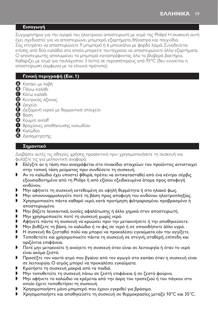Centre Service Agréé afin d’éviter tout accident. , N’exposez pas l’appareil à des températures élevées ni au soleil. , Pour éviter tout risque d’électrocution, ne démontez jamais le socle. , Utilisez toujours de l’eau propre, de préférence filtrée, bouillie ou stérilisée. , Ne versez pas d’eau de Javel, de détartrants ni d’autres produits chimiques dans le stérilisateur vapeur. , Ne faites jamais fonctionner l’appareil sans remplir le réservoir d’eau. , Laissez toujours l’appareil refroidir avant de le déplacer ou de le ranger. , Ne plongez jamais le socle, le cordon d’alimentation ou la fiche dans l’eau ou dans tout autre liquide. , L’appareil peut devenir très chaud et peut par conséquent provoquer des brûlures si vous le touchez. , Placez et utilisez toujours l’appareil sur une surface sèche, stable, plane et horizontale. , Ne déplacez et n’ouvrez jamais l’appareil en cours d’utilisation ou lorsque l’eau est encore chaude. , Faites attention à la vapeur s’échappant de l’orifice du couvercle en cours d’utilisation. Elle peut provoquer des brûlures. , Tenez l’appareil hors de portée des enfants. , Ne placez jamais l’appareil sur une surface chaude ou dans un four chaud. , Ne laissez pas le cordon pendre de la table ou du plan de travail sur lequel l’appareil est posé. , Utilisez uniquement des biberons pouvant être bouillis. , Conservez l’appareil à une température comprise entre 10 °C et 35 °C. , Videz toujours l’eau restant dans le réservoir après utilisation.