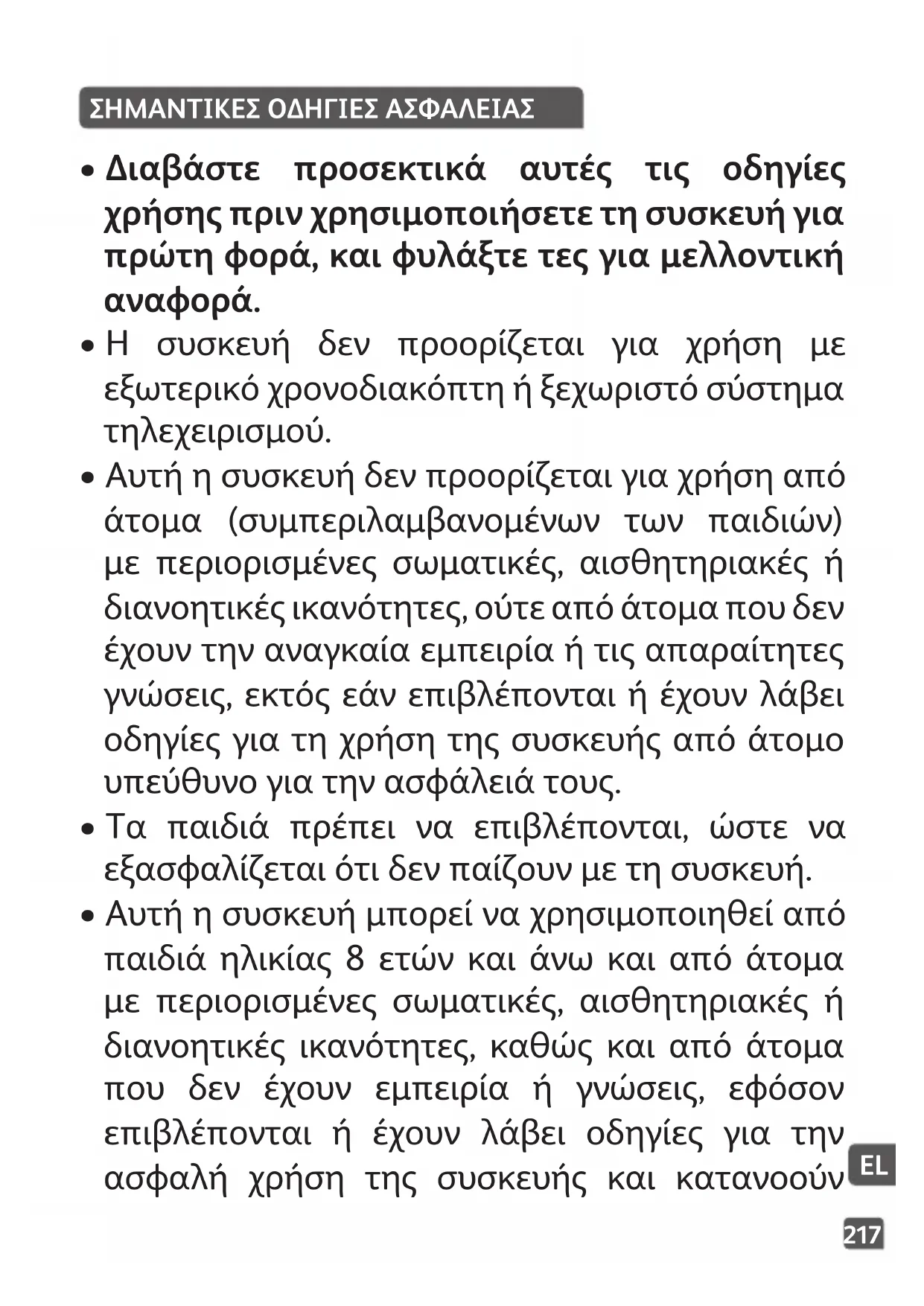 - Αυτή η συσκευή μπορεί να χρησιμοποιηθεί από παιδιά ηλικίας 8 ετών και άνω και από άτομα με περιορισμένες σωματικές, αισθητηριακές ή διανοητικές ικανότητες, καθώς και από άτομα που δεν έχουν εμπειρία ή γνώσεις, εφόσον επιβλέπονται ή έχουν λάβει οδηγίες για την ασφαλή χρήση της συσκευής και κατανοούν218 τους εμπλεκόμενους κινδύνους. Οι διαδικασίες καθαρισμού και συντήρησης της συσκευής που μπορούν να εκτελεστούν από τον χρήστη δεν πρέπει να πραγματοποιούνται από παιδιά, εκτός αν είναι πάνω από 8 ετών και επιβλέπονται.
