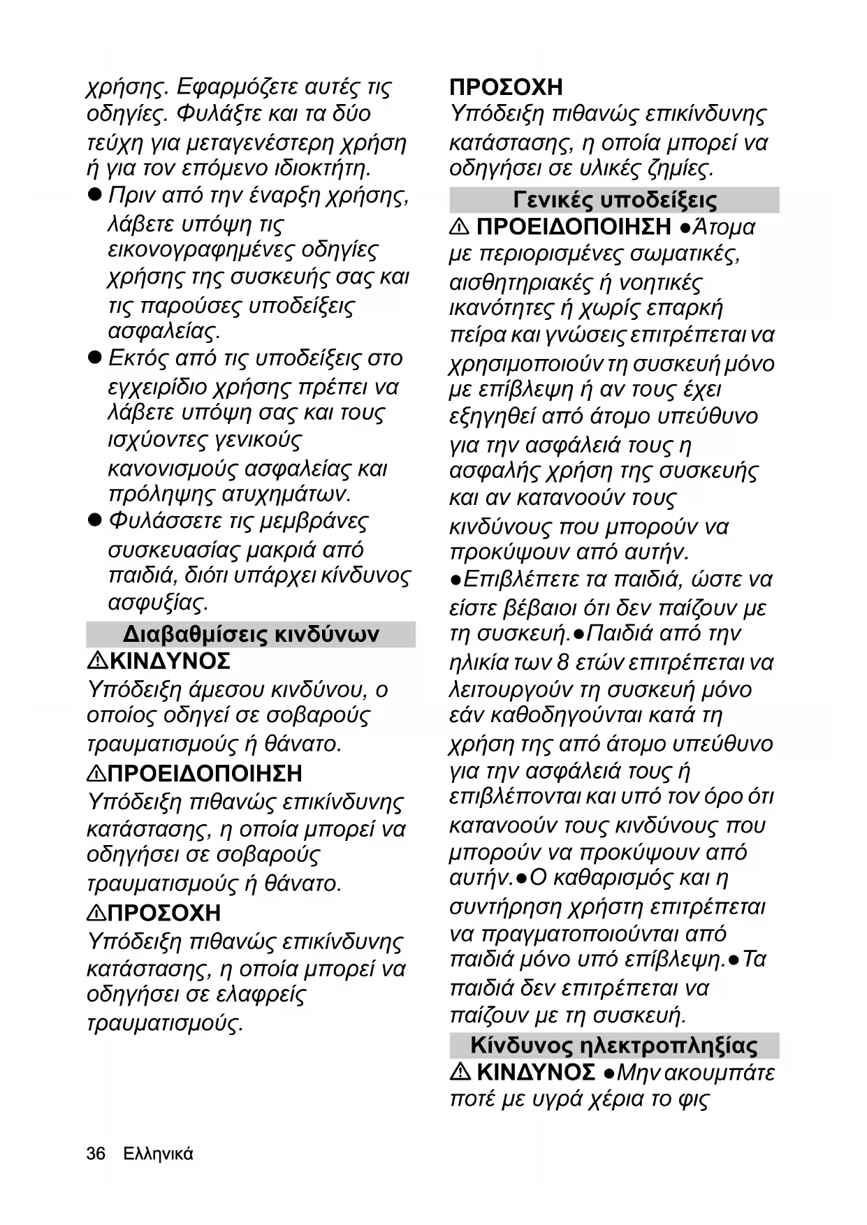 Υπόδειξη πιθανώς επικίνδυνης κατάστασης, η οποία μπορεί να οδηγήσει σε υλικές ζημίες. Γενικές υποδείξεις 몇 ΠΡΟΕΙΔΟΠΟΙΗΣΗ ●Άτομα με περιορισμένες σωματικές, αισθητηριακές ή νοητικές ικανότητες ή χωρίς επαρκή πείρα και γνώσεις επιτρέπεται να χρησιμοποιούν τη συσκευή μόνο με επίβλεψη ή αν τους έχει εξηγηθεί από άτομο υπεύθυνο για την ασφάλειά τους η ασφαλής χρήση της συσκευής και αν κατανοούν τους κινδύνους που μπορούν να προκύψουν από αυτήν. ●Επιβλέπετε τα παιδιά, ώστε να είστε βέβαιοι ότι δεν παίζουν με τη συσκευή.●Παιδιά από την ηλικία των 8 ετών επιτρέπεται να λειτουργούν τη συσκευή μόνο εάν καθοδηγούνται κατά τη χρήση της από άτομο υπεύθυνο