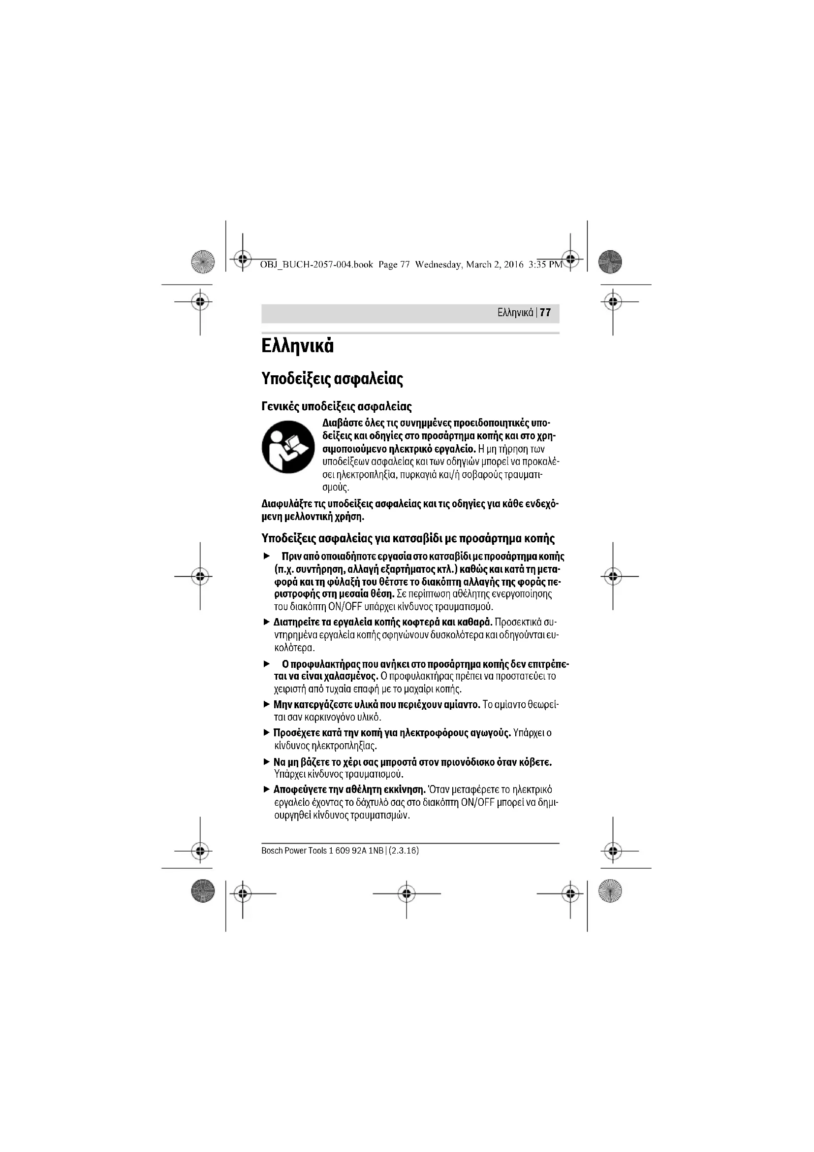 Ο προφυλακτήρας που ανήκει στο προσάρτημα κοπής δεν επιτρέπε- ται να είναι χαλασμένος. Ο προφυλακτήρας πρέπει να προστατεύει το χειριστή από τυχαία επαφή με το μαχαίρι κοπής. Μην κατεργάζεστε υλικά που περιέχουν αμίαντο. Το αμίαντο θεωρεί- ται σαν καρκινογόνο υλικό. Προσέχετε κατά την κοπή για ηλεκτροφόρους αγωγούς. Υπάρχει ο κίνδυνος ηλεκτροπληξίας. Να μη βάζετε το χέρι σας μπροστά στον πριονόδισκο όταν κόβετε. Υπάρχει κίνδυνος τραυματισμού. Αποφεύγετε την αθέλητη εκκίνηση. Όταν μεταφέρετε το ηλεκτρικό εργαλείο έχοντας το δάχτυλό σας στο διακόπτη ON/OFF μπορεί να δημι- ουργηθεί κίνδυνος τραυματισμών. OBJ_BUCH-2057-004.book Page 77 Wednesday, March 2, 2016 3:35 PM78 | Ελληνικά 1 609 92A 1NB | (2.3.16) Bosch Power Tools Επιβλέπετε τα παιδιά. Έτσι εξασφαλίζεται, ότι τα παιδιά δεν πρόκειται να παίξουν με το προσάρτημα κοπής ή με το κατσαβίδι με συναρμολογη- μένο προσάρτημα κοπής. Αυτό το κατσαβίδι με προσάρτημα κοπής δεν προβλέπεται για χρή- ση από παιδιά και άτομα με περιορισμένες φυσικές, αισθητήριες ή διανοητικές ικανότητες ή με έλλειψη εμπειρίας και ανεπαρκείς