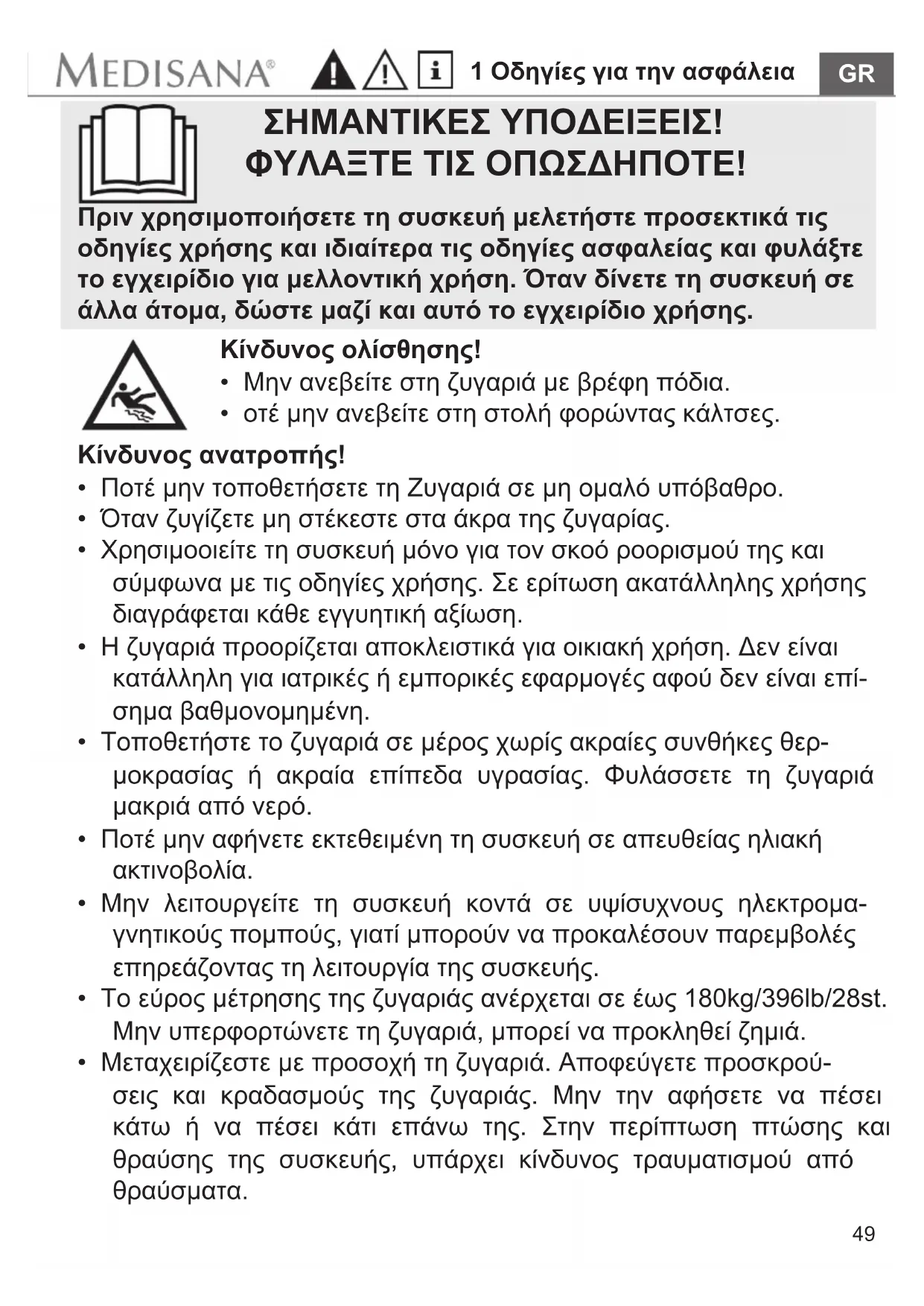 - Όταν ζυγίζετε μη στέκεστε στα άκρα της ζυγαρίας.50 1 Οδηγίες για την ασφάλεια