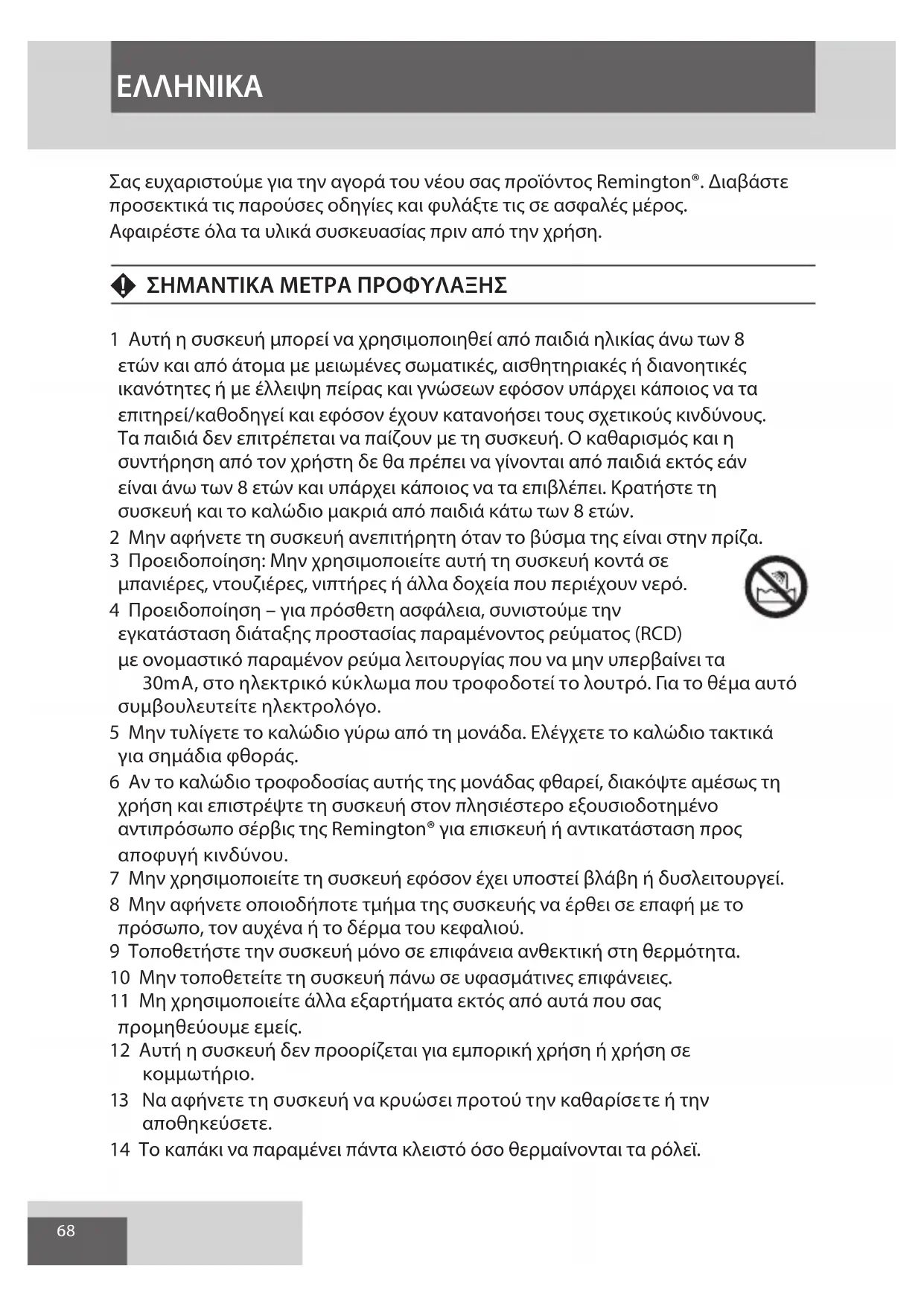 Pentru a evita problemele care afectează mediul sau sănătatea, datorită substanțelor nocive din aparatele electrice sau electronice, aparatele care prezintă acest simbol nu se aruncă la întâmplare, ci vor reciclate sau depozitate în locuri special amenajate în acest sens. ROMANIA GBDNLFEIDKSFINPSKCZ HUN PLRUTRROGRSI AE HR UA68 Σας ευχαριστούμε για την αγορά του νέου σας προϊόντος Remington®. Διαβάστε προσεκτικά τις παρούσες οδηγίες και φυλάξτε τις σε ασφαλές μέρος. Αφαιρέστε όλα τα υλικά συσκευασίας πριν από την χρήση. F ΣΗΜΑΝΤΙΚΑ ΜΕΤΡΑ ΠΡΟΦΥΛΑΞΗΣ 1 Αυτή η συσκευή μπορεί να χρησιμοποιηθεί από παιδιά ηλικίας άνω των 8 ετών και από άτομα με μειωμένες σωματικές, αισθητηριακές ή διανοητικές ικανότητες ή με έλλειψη πείρας και γνώσεων εφόσον υπάρχει κάποιος να τα επιτηρεί/καθοδηγεί και εφόσον έχουν κατανοήσει τους σχετικούς κινδύνους. Τα παιδιά δεν επιτρέπεται να παίζουν με τη συσκευή. Ο καθαρισμός και η συντήρηση από τον χρήστη δε θα πρέπει να γίνονται από παιδιά εκτός εάν είναι άνω των 8 ετών και υπάρχει κάποιος να τα επιβλέπει. Κρατήστε τη συσκευή και το καλώδιο μακριά από παιδιά κάτω των 8 ετών. 2 Μην αφήνετε τη συσκευή ανεπιτήρητη όταν το βύσμα της είναι στην πρίζα. 3 Προειδοποίηση: Μην χρησιμοποιείτε αυτή τη συσκευή κοντά σε μπανιέρες, ντουζιέρες, νιπτήρες ή άλλα δοχεία που περιέχουν νερό. 4 Προειδοποίηση – για πρόσθετη ασφάλεια, συνιστούμε την εγκατάσταση διάταξης προστασίας παραμένοντος ρεύματος (RCD) με ονομαστικό παραμένον ρεύμα λειτουργίας που να μην υπερβαίνει τα 30mA, στο ηλεκτρικό κύκλωμα που τροφοδοτεί το λουτρό. Για το θέμα αυτό συμβουλευτείτε ηλεκτρολόγο. 5 Μην τυλίγετε το καλώδιο γύρω από τη μονάδα. Ελέγχετε το καλώδιο τακτικά για σημάδια φθοράς. 6 Αν το καλώδιο τροφοδοσίας αυτής της μονάδας φθαρεί, διακόψτε αμέσως τη χρήση και επιστρέψτε τη συσκευή στον πλησιέστερο εξουσιοδοτημένο αντιπρόσωπο σέρβις της Remington® για επισκευή ή αντικατάσταση προς αποφυγή κινδύνου. 7 Μην χρησιμοποιείτε τη συσκευή εφόσον έχει υποστεί βλάβη ή δυσλειτουργεί. 8 Μην αφήνετε οποιοδήποτε τμήμα της συσκευής να έρθει σε επαφή με το πρόσωπο, τον αυχένα ή το δέρμα του κεφαλιού. 9 Τοποθετήστε την συσκευή μόνο σε επιφάνεια ανθεκτική στη θερμότητα. 10 Μην τοποθετείτε τη συσκευή πάνω σε υφασμάτινες επιφάνειες. 11 Μη χρησιμοποιείτε άλλα εξαρτήματα εκτός από αυτά που σας προμηθεύουμε εμείς. 12 Αυτή η συσκευή δεν προορίζεται για εμπορική χρήση ή χρήση σε κομμωτήριο. 13 Να αφήνετε τη συσκευή να κρυώσει προτού την καθαρίσετε ή την αποθηκεύσετε. 14 Το καπάκι να παραμένει πάντα κλειστό όσο θερμαίνονται τα ρόλεϊ. ΕΛΛΗΝΙΚΑ69 15 Φροντίστε να υπάρχει ένα ρόλεϊ σε κάθε υποδοχή όσο θερμαίνεται η μονάδα και ότι κάθε ρόλεϊ έχει τοποθετηθεί σωστά στην κεντρική μονάδα. 16 ΝΑ ΜΗΝ ΧΡΗΣΙΜΟΠΟΙΟΥΝΤΑΙ ΠΕΡΟΥΚΙΝΙΑ Ή ΠΕΡΟΥΚΕΣ ΜΕ ΣΥΝΘΕ ΤΙΚΗ