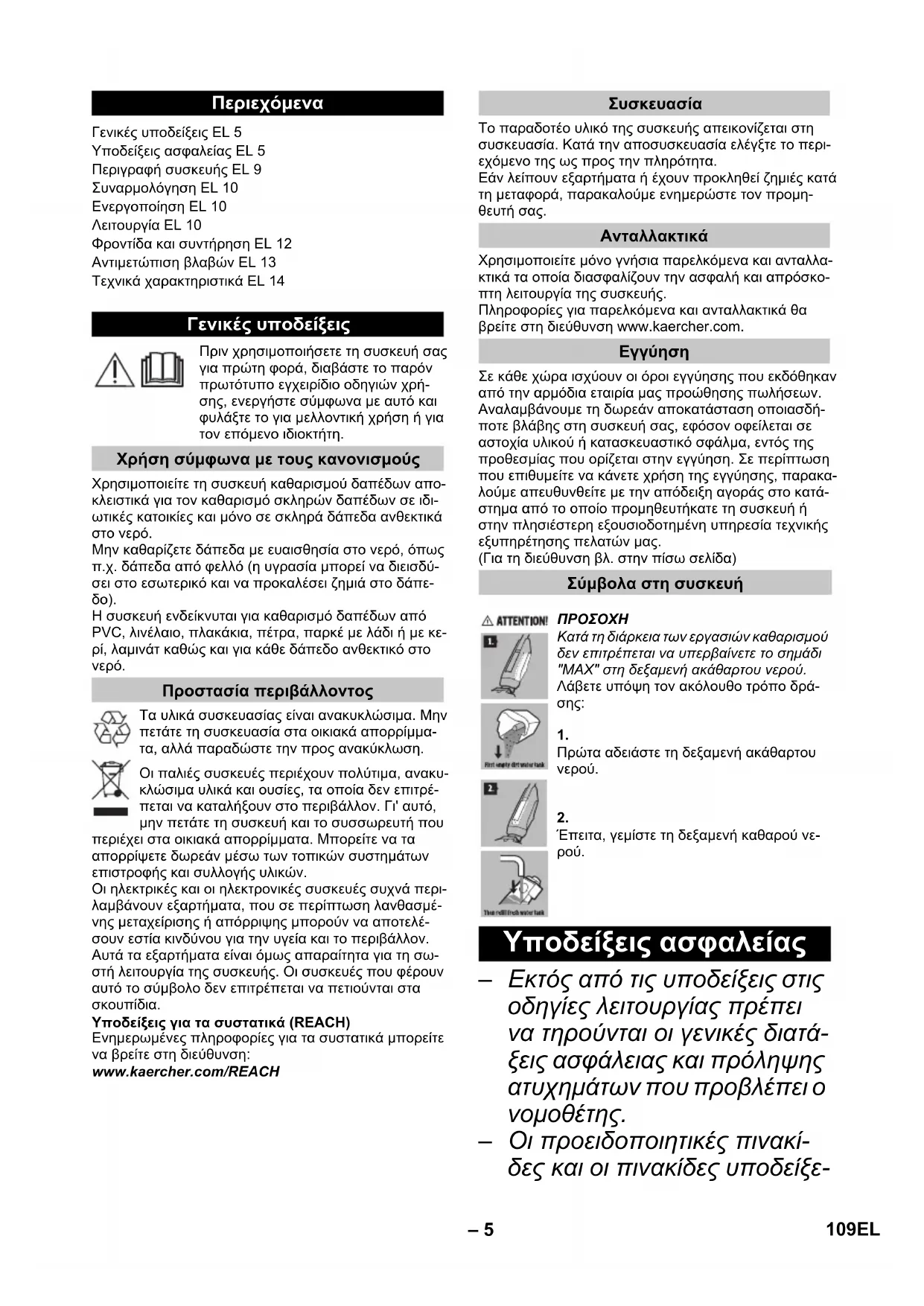 Υποδείξεις ασφαλείας 109EL– 6 ων που είναι τοποθετημένες στη συσκευή, παρέχουν ση- μαντικές υποδείξεις για την ασφαλή λειτουργία.