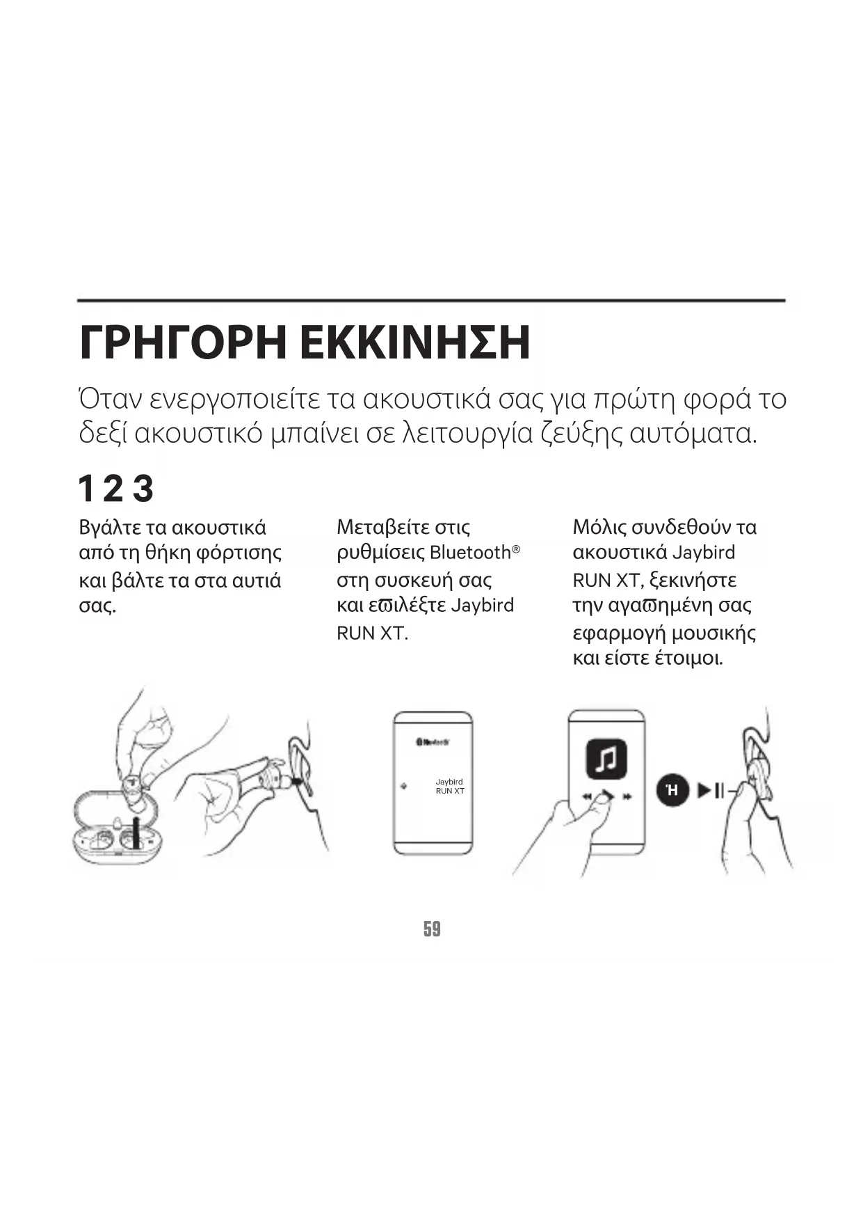Μεταβείτε στις ρυθμίσεις Bluetooth® στη συσκευή σας και επιλέξτε Jaybird RUN XT. Μόλις συνδεθούν τα ακουστικά Jaybird RUN XT, ξεκινήστε την αγαπημένη σας εφαρμογή μουσικής και είστε έτοιμοι. Όταν ενεργοποιείτε τα ακουστικά σας για πρώτη φορά το δεξί ακουστικό μπαίνει σε λειτουργία ζεύξης αυτόματα. ΓΡΗΓΟΡΗ ΕΚΚΙΝΗΣΗ Jaybird RUN XT Ή60