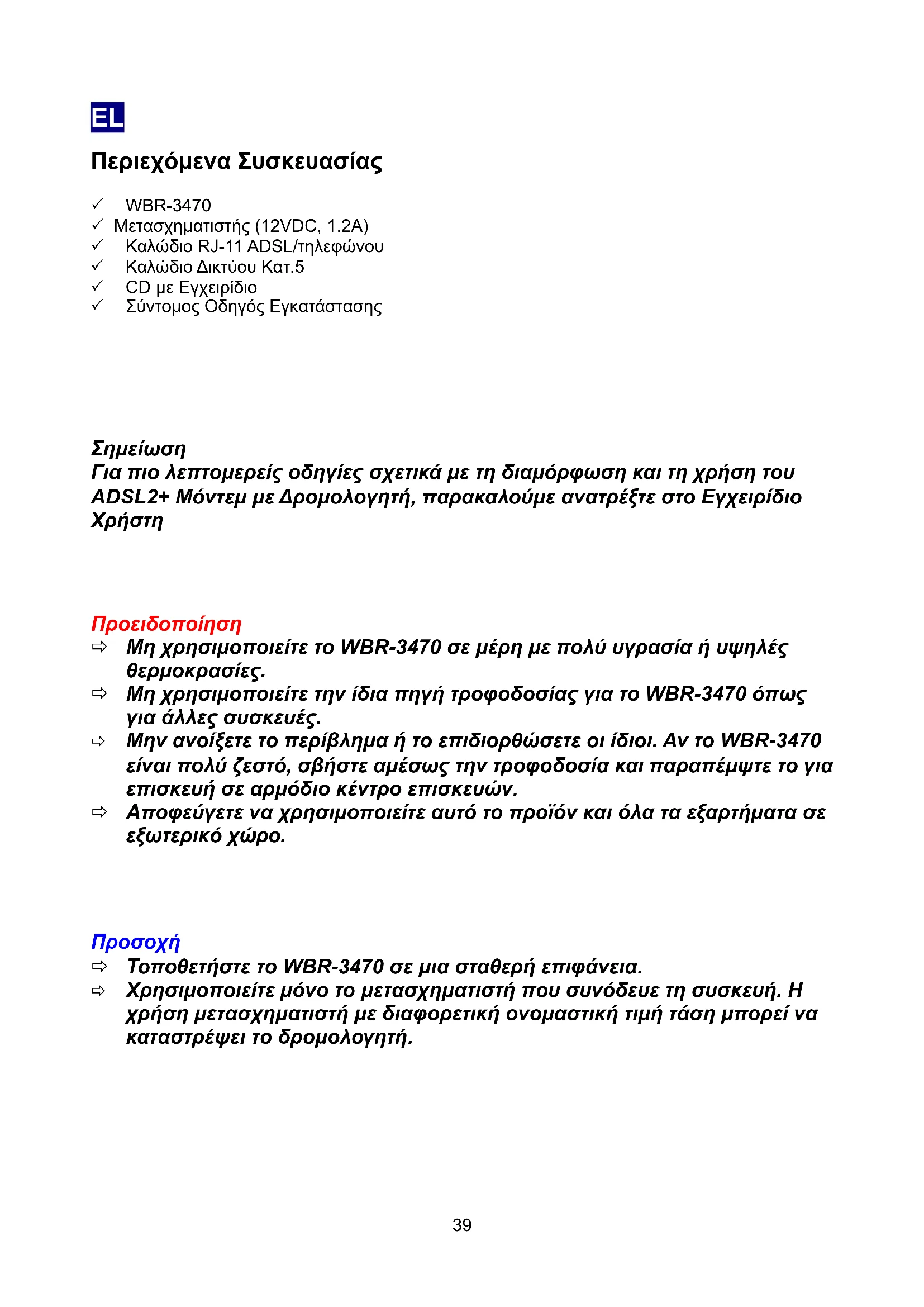 38EL Περιεχόμενα Συσκευασίας 3 WBR-3470 3 Μετασχηματιστής (12VDC, 1.2A) 3 Καλώδιο RJ-11 ADSL/τηλεφώνου 3 Καλώδιο Δικτύου Κατ.5 3 CD με Εγχειρίδιο 3 Σύντομος Οδηγός Εγκατάστασης