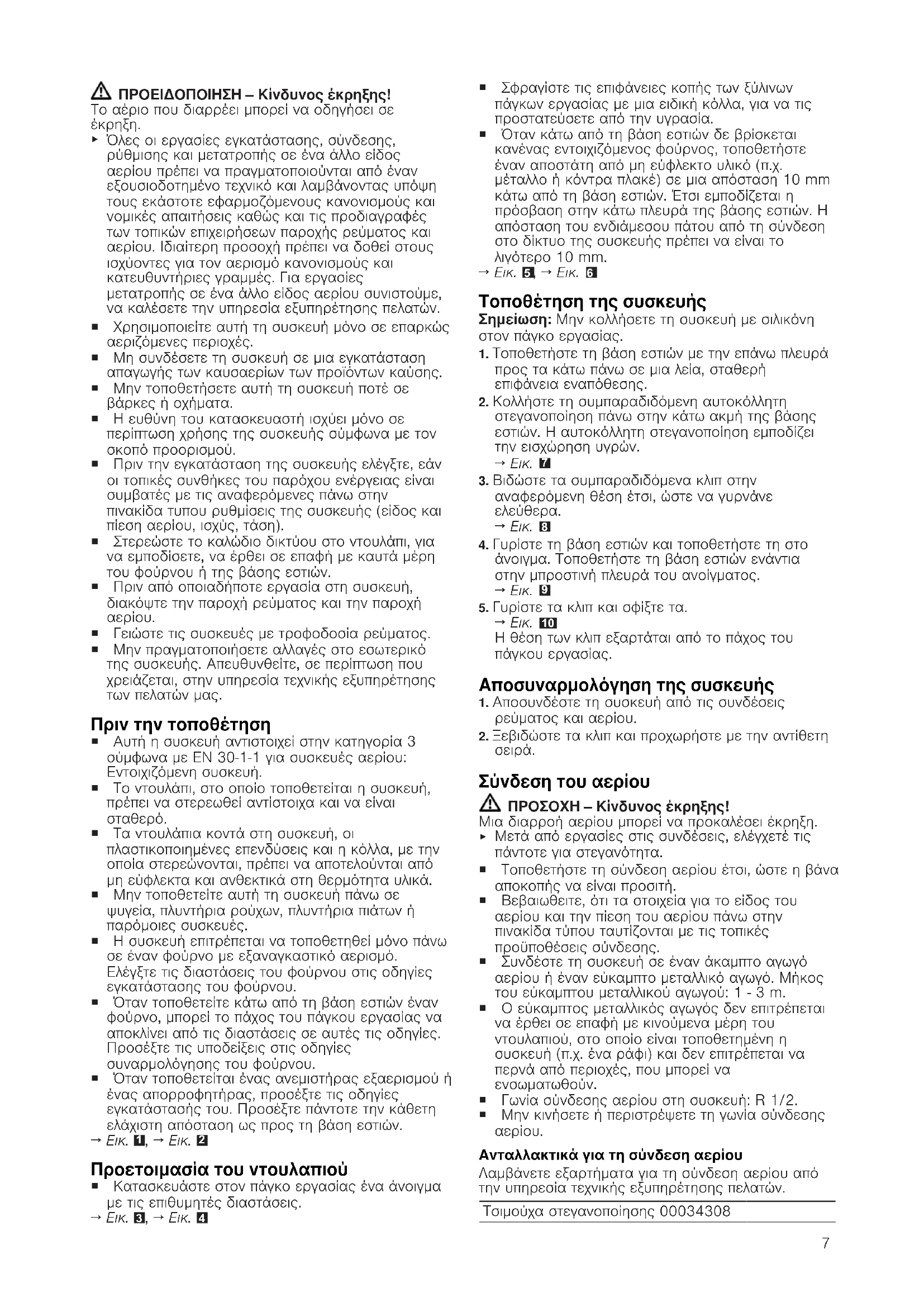 Ασφαλής συναρμολόγηση Προσέξτε αυτές τις υποδείξεις ασφαλείας, όταν συναρμολογείτε τη συσκευή. ¡ Διαβάστε προσεκτικά αυτές τις οδηγίες. ¡ Οι εικόνες που υπάρχουν σ'αυτές τις οδηγίες είναι μόνο ενδεικτικές. ¡ Μόνο με τη σωστή τοποθέτηση σύμφωνα με τις οδηγίες τοποθέτησης διασφαλίζεται η ασφάλεια κατά τη χρήση. Ο εγκαταστάτης είναι υπεύθυνος για την άψογη λειτουργία στη θέση τοποθέτησης.7 ΠΡΟΕΙΔΟΠΟΙΗΣΗ‒Κίνδυνος έκρηξης! Το αέριο που διαρρέει μπορεί να οδηγήσει σε