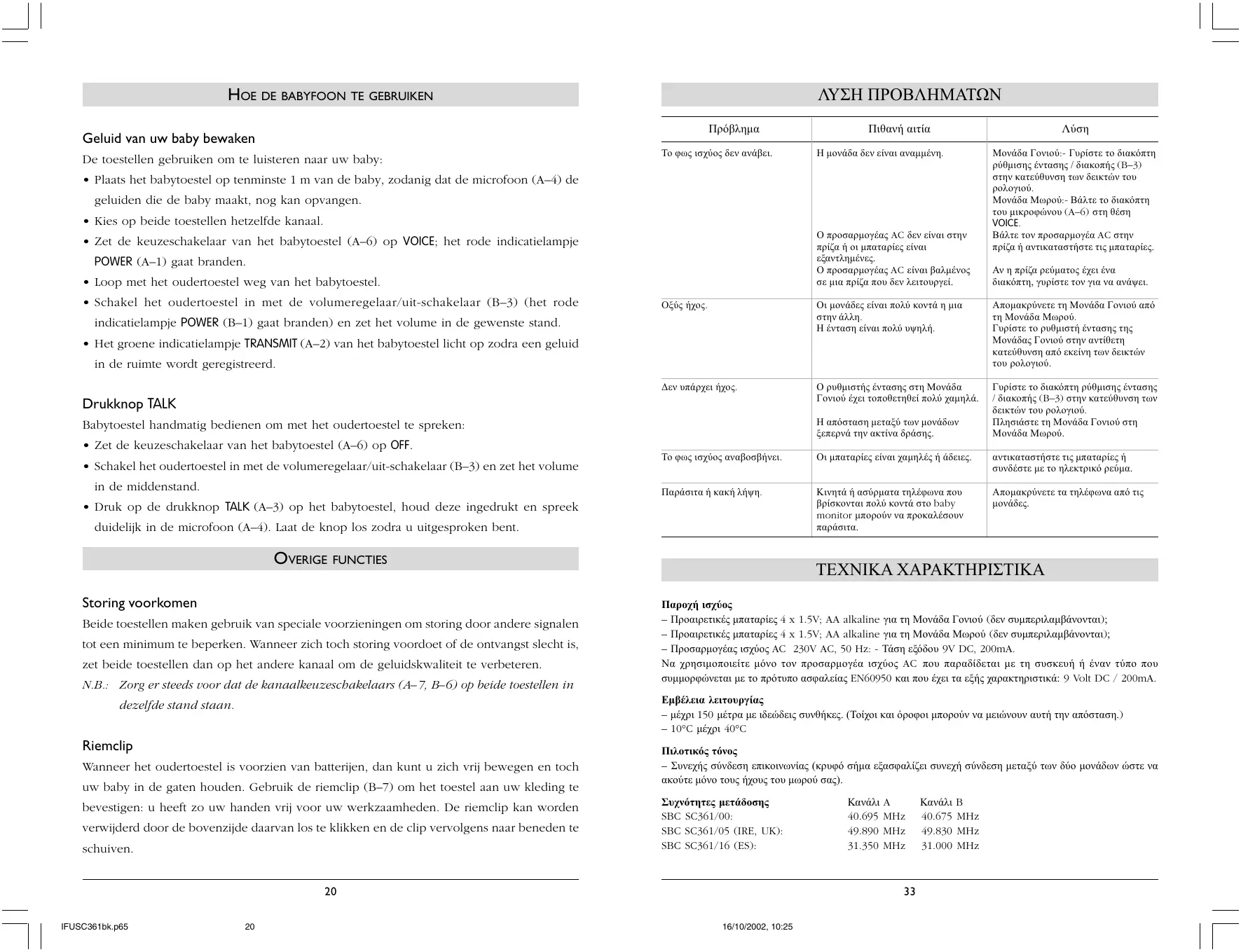- Στη Μονάδα Μωρού, πατήστε και κρατήστε πατηµένο το κουµπί επαφής TALK (A–3) και µιλήστε καθαρά στο µικρόφωνο (A–4). Αφήστε το κουµπί επαφής TALK όταν τελειώσετε. TECHNISCHE GEGEVENS ΠΡΟΣΘΕΤΕΣ ∆ΥΝΑΤΟΤΗΤΕΣ Voeding: Αποφυγή παρασίτων Και οι δύο µονάδες χρησιµοποιούν αντιπαρασιτική τεχνολογία ώστε να µειώνεται η πιθανότητα παρεµβολών από άλλα σήµατα. Αν υπάρχουν παράσιτα ή αν η λήψη ήχου είναι κακή, προσπαθήστε να βελτιώσετε την ποιότητα του ήχου γυρίζοντας και τις δύο µονάδες στο άλλο κανάλι.