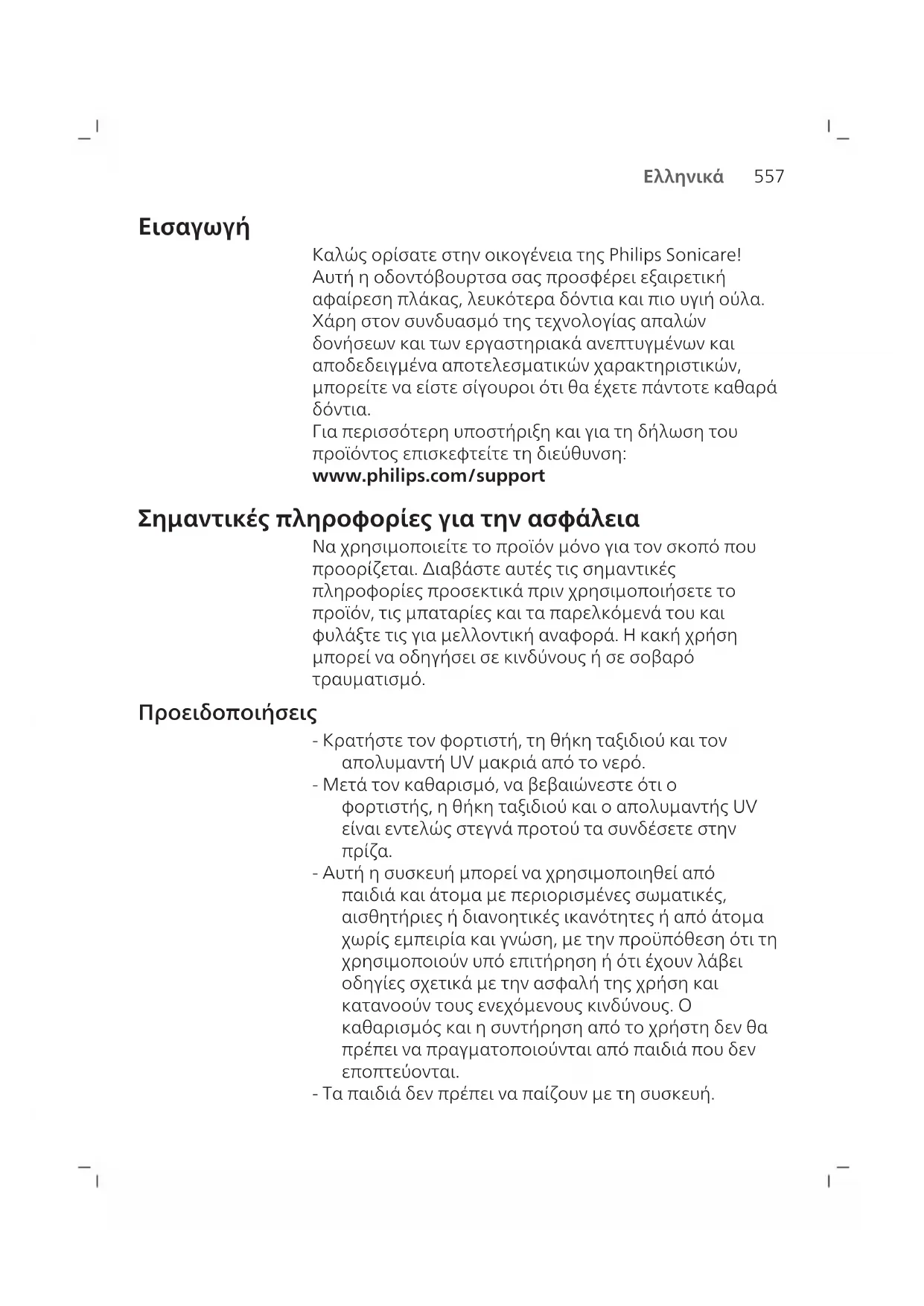 Για περισσότερη υποστήριξη και για τη δήλωση του προϊόντος επισκεφτείτε τη διεύθυνση: www.philips.com/support Σημαντικές πληροφορίες για την ασφάλεια Να χρησιμοποιείτε το προϊόν μόνο για τον σκοπό που προορίζεται. Διαβάστε αυτές τις σημαντικές πληροφορίες προσεκτικά πριν χρησιμοποιήσετε το προϊόν, τις μπαταρίες και τα παρελκόμενά του και φυλάξτε τις για μελλοντική αναφορά. Η κακή χρήση μπορεί να οδηγήσει σε κινδύνους ή σε σοβαρό τραυματισμό. Προειδοποιήσεις - Κρατήστε τον φορτιστή, τη θήκη ταξιδιού και τον απολυμαντή UV μακριά από το νερό. - Μετά τον καθαρισμό, να βεβαιώνεστε ότι ο φορτιστής, η θήκη ταξιδιού και ο απολυμαντής UV είναι εντελώς στεγνά προτού τα συνδέσετε στην