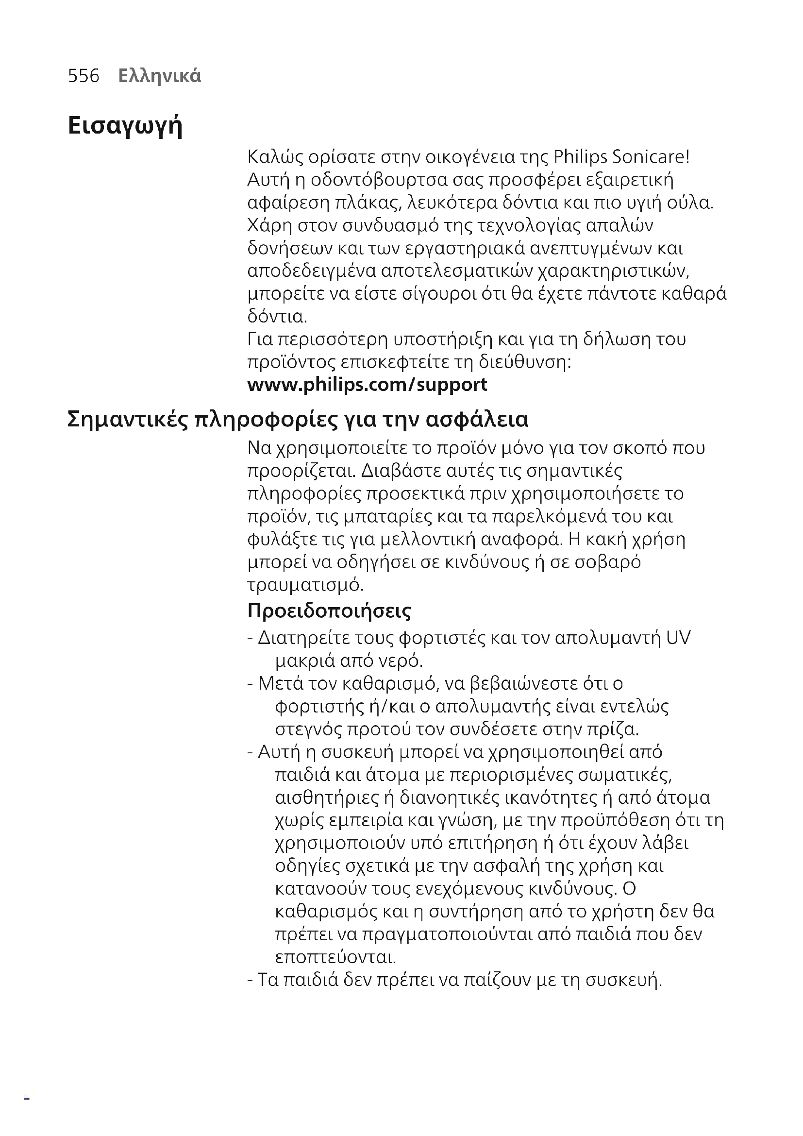 Για περισσότερη υποστήριξη και για τη δήλωση του προϊόντος επισκεφτείτε τη διεύθυνση: www.philips.com/support Σημαντικές πληροφορίες για την ασφάλεια Να χρησιμοποιείτε το προϊόν μόνο για τον σκοπό που προορίζεται. Διαβάστε αυτές τις σημαντικές πληροφορίες προσεκτικά πριν χρησιμοποιήσετε το προϊόν, τις μπαταρίες και τα παρελκόμενά του και φυλάξτε τις για μελλοντική αναφορά. Η κακή χρήση μπορεί να οδηγήσει σε κινδύνους ή σε σοβαρό τραυματισμό. Προειδοποιήσεις - Διατηρείτε τους φορτιστές και τον απολυμαντή UV μακριά από νερό. - Μετά τον καθαρισμό, να βεβαιώνεστε ότι ο φορτιστής ή/και ο απολυμαντής είναι εντελώς στεγνός προτού τον συνδέσετε στην πρίζα. - Αυτή η συσκευή μπορεί να χρησιμοποιηθεί από παιδιά και άτομα με περιορισμένες σωματικές, αισθητήριες ή διανοητικές ικανότητες ή από άτομα χωρίς εμπειρία και γνώση, με την προϋπόθεση ότι τη χρησιμοποιούν υπό επιτήρηση ή ότι έχουν λάβει οδηγίες σχετικά με την ασφαλή της χρήση και κατανοούν τους ενεχόμενους κινδύνους. Ο καθαρισμός και η συντήρηση από το χρήστη δεν θα πρέπει να πραγματοποιούνται από παιδιά που δεν εποπτεύονται. - Τα παιδιά δεν πρέπει να παίζουν με τη συσκευή.557