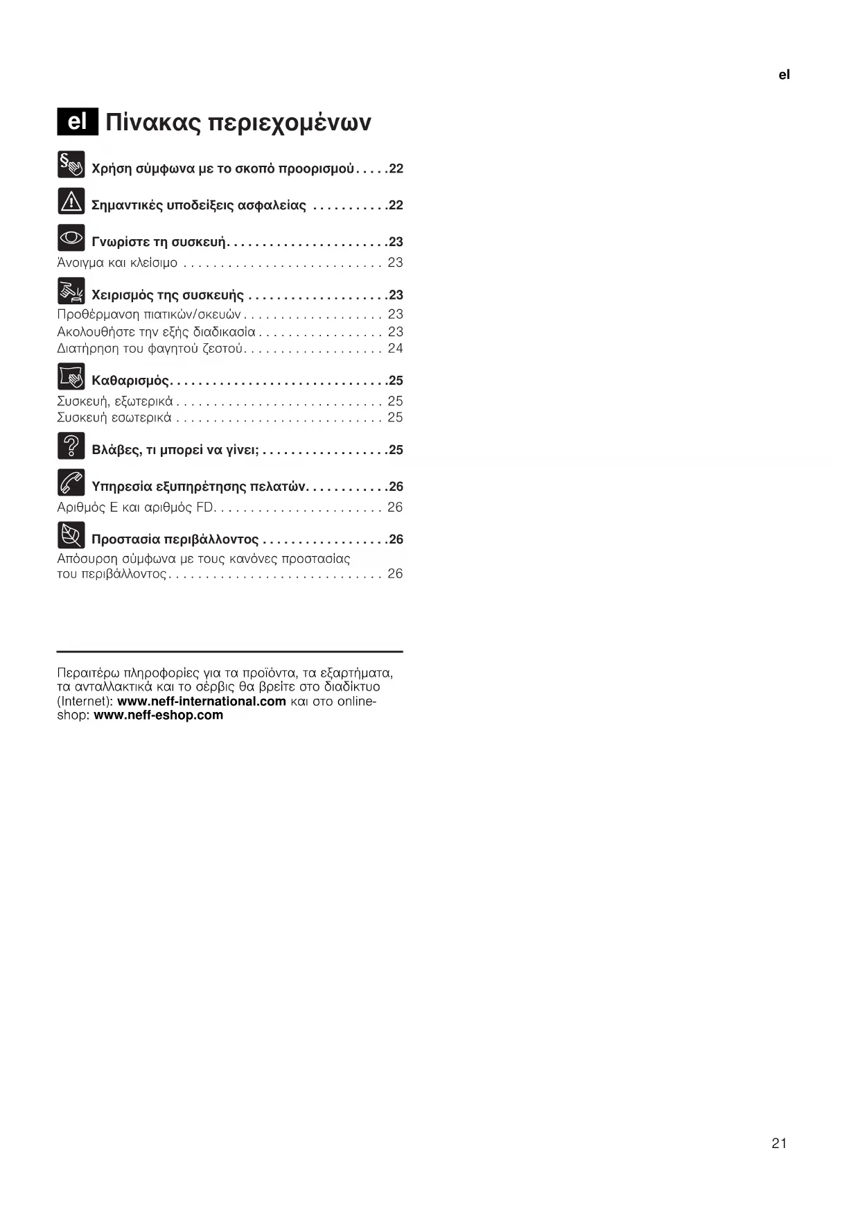 - Γνωρίστε τη συσκευή. . . . . . . . . . . . . . . . . . . . . . .23 Άνοιγμα και κλείσιμο . . . . . . . . . . . . . . . . . . . . . . . . . . . 23 1 Χειρισμός της συσκευής . . . . . . . . . . . . . . . . . . . .23 Προθέρμανση πιατικών/σκευών . . . . . . . . . . . . . . . . . . . 23 Ακολουθήστε την εξής διαδικασία . . . . . . . . . . . . . . . . . 23 Διατήρηση του φαγητού ζεστού. . . . . . . . . . . . . . . . . . . 24 D Καθαρισμός. . . . . . . . . . . . . . . . . . . . . . . . . . . . . . .25 Συσκευή, εξωτερικά . . . . . . . . . . . . . . . . . . . . . . . . . . . . 25 Συσκευή εσωτερικά . . . . . . . . . . . . . . . . . . . . . . . . . . . . 25 3 Βλάβες, τι μπορεί να γίνει; . . . . . . . . . . . . . . . . . .25 4 Υπηρεσία εξυπηρέτησης πελατών. . . . . . . . . . . .26 Αριθμός E και αριθμός FD. . . . . . . . . . . . . . . . . . . . . . . 26 7 Προστασία περιβάλλοντος . . . . . . . . . . . . . . . . . .26 Απόσυρση σύμφωνα με τους κανόνες προστασίας του περιβάλλοντος . . . . . . . . . . . . . . . . . . . . . . . . . . . . . 26 Produktinfo Περαιτέρω πληροφορίες για τα προϊόντα, τα εξαρτήματα, τα ανταλλακτικά και το σέρβις θα βρείτε στο διαδίκτυο (Internet): www.neff-international.com και στο online- shop: www.neff-eshop.comel Χρήση σύμφωνα με το σκοπό προορισμού