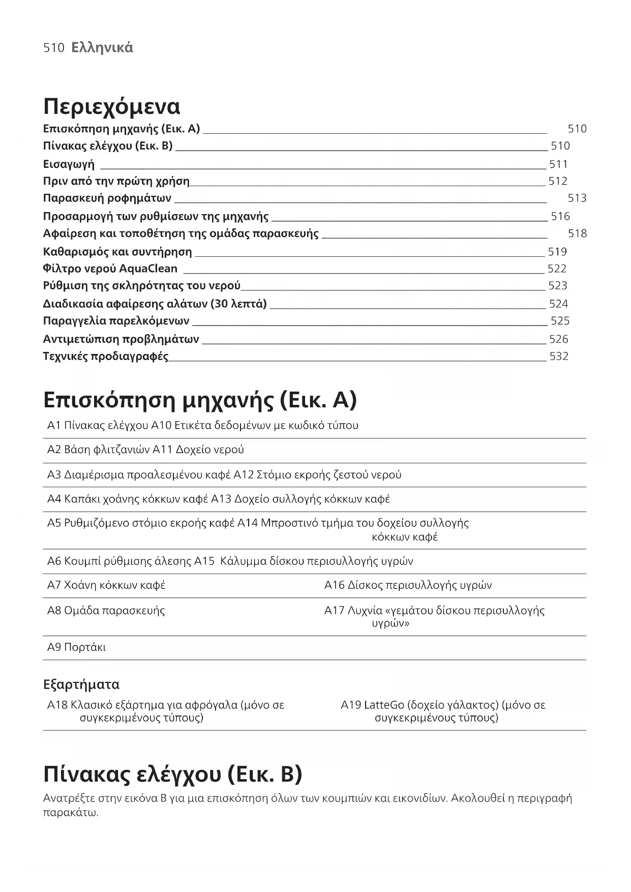 Περιεχόμενα Επισκόπηση μηχανής (Εικ. Α) _____________________________________________________________ 510 Πίνακας ελέγχου (Εικ. B) __________________________________________________________________ 510Εισαγωγή _______________________________________________________________________________ 511Πριν από την πρώτη χρήση_______________________________________________________________ 512 Παρασκευή ροφημάτων __________________________________________________________________ 513 Προσαρμογή των ρυθμίσεων της μηχανής _________________________________________________ 516 Αφαίρεση και τοποθέτηση της ομάδας παρασκευής ________________________________________ 518 Καθαρισμός και συντήρηση ______________________________________________________________ 519Φίλτρο νερού AquaClean ________________________________________________________________ 522Ρύθμιση της σκληρότητας του νερού______________________________________________________ 523Διαδικασία αφαίρεσης αλάτων (30 λεπτά) _________________________________________________ 524Παραγγελία παρελκόμενων _______________________________________________________________ 525Αντιμετώπιση προβλημάτων _____________________________________________________________ 526Τεχνικές προδιαγραφές___________________________________________________________________ 532 Επισκόπηση μηχανής (Εικ. Α) A1 Πίνακας ελέγχου A10 Ετικέτα δεδομένων με κωδικό τύπουA2 Βάση φλιτζανιών A11 Δοχείο νερούA3 Διαμέρισμα προαλεσμένου καφέ A12 Στόμιο εκροής ζεστού νερούA4 Καπάκι χοάνης κόκκων καφέ A13 Δοχείο συλλογής κόκκων καφέA5 Ρυθμιζόμενο στόμιο εκροής καφέ A14 Μπροστινό τμήμα του δοχείου συλλογήςκόκκων καφέA6 Κουμπί ρύθμισης άλεσης A15 Κάλυμμα δίσκου περισυλλογής υγρώνA7 Χοάνη κόκκων καφέ A16 Δίσκος περισυλλογής υγρώνA8 Ομάδα παρασκευής A17 Λυχνία «γεμάτου δίσκου περισυλλογήςυγρών»A9 Πορτάκι A18 Κλασικό εξάρτημα για αφρόγαλα (μόνο σεσυγκεκριμένους τύπους)A19 LatteGo (δοχείο γάλακτος) (μόνο σεσυγκεκριμένους τύπους) Πίνακας ελέγχου (Εικ. B) Ανατρέξτε στην εικόνα B για μια επισκόπηση όλων των κουμπιών και εικονιδίων. Ακολουθεί η περιγραφήπαρακάτω.511