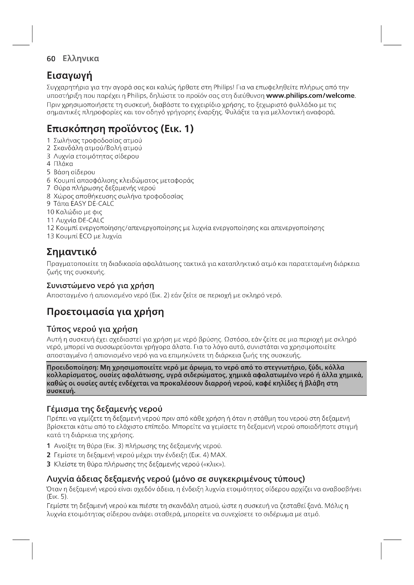 Συγχαρητήρια για την αγορά σας και καλώς ήρθατε στη Philips! Για να επωφεληθείτε πλήρως από την υποστήριξη που παρέχει η Philips, δηλώστε το προϊόν σας στη διεύθυνση www.philips.com/welcome. Πριν χρησιμοποιήσετε τη συσκευή, διαβάστε το εγχειρίδιο χρήσης, το ξεχωριστό φυλλάδιο με τις σημαντικές πληροφορίες και τον οδηγό γρήγορης έναρξης. Φυλάξτε τα για μελλοντική αναφορά. Επισκόπηση προϊόντος (Εικ. 1) 1 Σωλήνας τροφοδοσίας ατμού 2 Σκανδάλη ατμού/Βολή ατμού 3 Λυχνία ετοιμότητας σίδερου 4 Πλάκα 5 Βάση σίδερου 6 Κουμπί απασφάλισης κλειδώματος μεταφοράς 7 Θύρα πλήρωσης δεξαμενής νερού 8 Χώρος αποθήκευσης σωλήνα τροφοδοσίας 9 Τάπα EASY DE-CALC 10 Καλώδιο με φις 11 Λυχνία DE-CALC 12 Κουμπί ενεργοποίησης/απενεργοποίησης με λυχνία ενεργοποίησης και απενεργοποίησης 13 Κουμπί ECO με λυχνία
