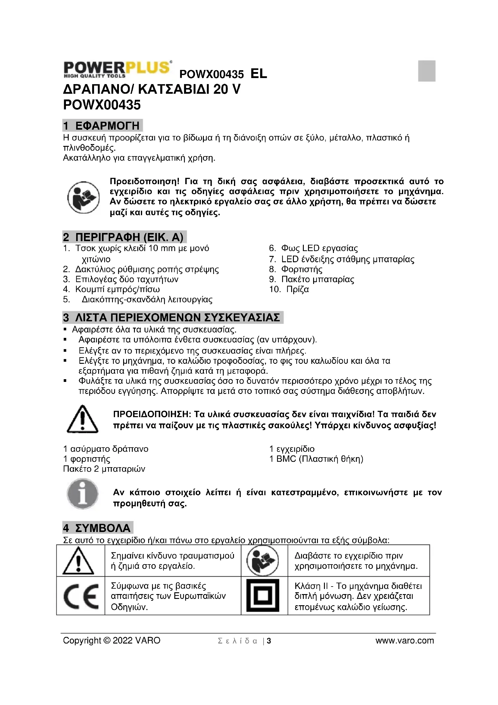 Κλάση II - Το μηχάνημα διαθέτει διπλή μόνωση. Δεν χρειάζεται επομένως καλώδιο γείωσης.POWX00435 EL Copyright © 2022 VARO Σ ε λ ί δ α | 4 www.varo.com