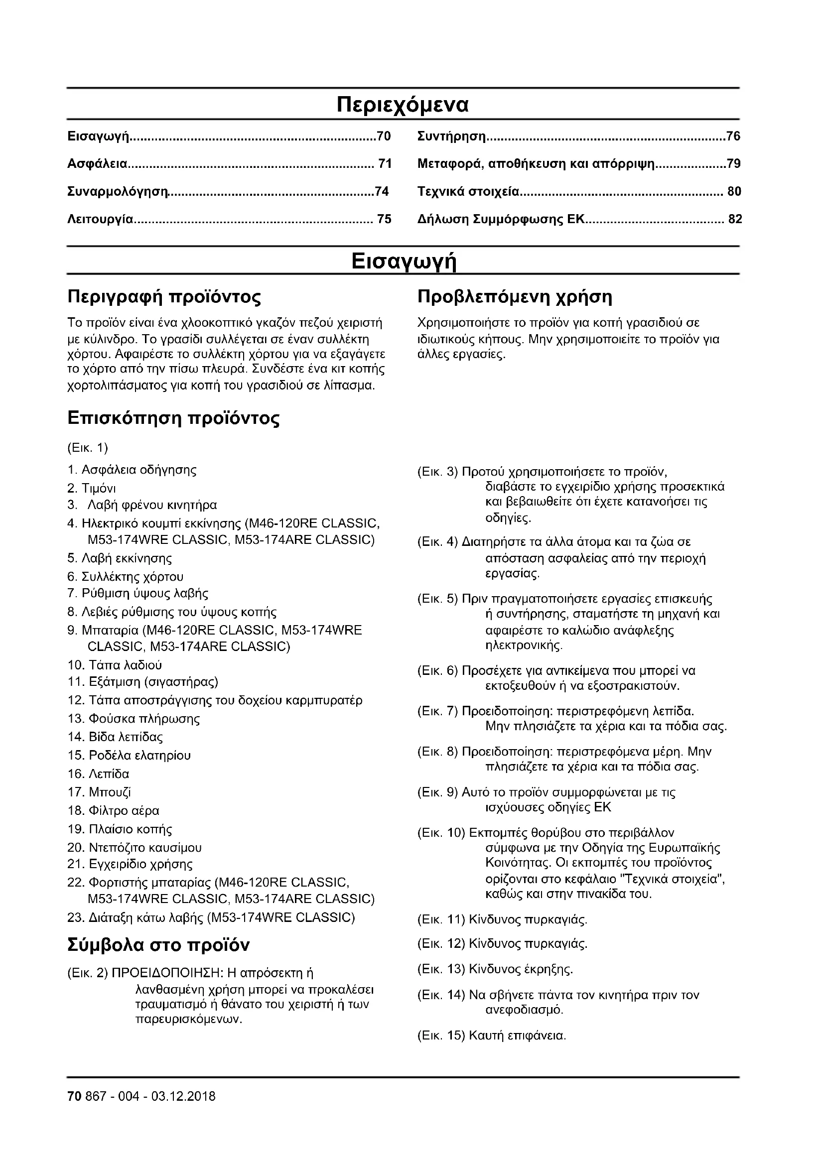 (Εικ. 5) Πριν πραγματοποιήσετε εργασίες επισκευής ή συντήρησης, σταματήστε τη μηχανή και αφαιρέστε το καλώδιο ανάφλεξης ηλεκτρονικής. (Εικ. 6) Προσέχετε για αντικείμενα που μπορεί να εκτοξευθούν ή να εξοστρακιστούν. (Εικ. 7) Προειδοποίηση: περιστρεφόμενη λεπίδα. Μην πλησιάζετε τα χέρια και τα πόδια σας. (Εικ. 8) Προειδοποίηση: περιστρεφόμενα μέρη. Μην πλησιάζετε τα χέρια και τα πόδια σας. (Εικ. 9) Αυτό το προϊόν συμμορφώνεται με τις ισχύουσες οδηγίες ΕΚ (Εικ. 10) Εκπομπές θορύβου στο περιβάλλον σύμφωνα με την Οδηγία της Ευρωπαϊκής Κοινότητας. Οι εκπομπές του προϊόντος ορίζονται στο κεφάλαιο "Τεχνικά στοιχεία", καθώς και στην πινακίδα του. (Εικ. 11) Κίνδυνος πυρκαγιάς. (Εικ. 12) Κίνδυνος πυρκαγιάς. (Εικ. 13) Κίνδυνος έκρηξης. (Εικ. 14) Να σβήνετε πάντα τον κινητήρα πριν τον ανεφοδιασμό. (Εικ. 15) Καυτή επιφάνεια. 70 867 - 004 - 03.12.2018(Εικ. 16) Οι αναθυμιάσεις της εξάτμισης από τον κινητήρα περιέχουν μονοξείδιο του άνθρακα, ένα άοσμο, δηλητηριώδες και ιδιαίτερα επικίνδυνο αέριο. Μην χρησιμοποιείτε το προϊόν σε εσωτερικούς ή κλειστούς χώρους. (Εικ. 17) Οι αναθυμιάσεις της εξάτμισης από τον κινητήρα περιέχουν μονοξείδιο του άνθρακα, ένα άοσμο, δηλητηριώδες και ιδιαίτερα επικίνδυνο αέριο. Μην χρησιμοποιείτε το προϊόν σε εσωτερικούς ή κλειστούς χώρους. Περιεχόμενα Άλλα σύμβολα/σήματα που υπάρχουν στο προϊόν αναφέρονται σε απαιτήσεις πιστοποίησης για άλλες εμπορικές περιοχές. EU V ΠΡΟΕΙΔΟΠΟΙΗΣΗ: Οποιαδήποτε μη εξουσιοδοτημένη παρέμβαση στον κινητήρα ακυρώνει την έγκριση τύπου ΕΕ αυτού του
