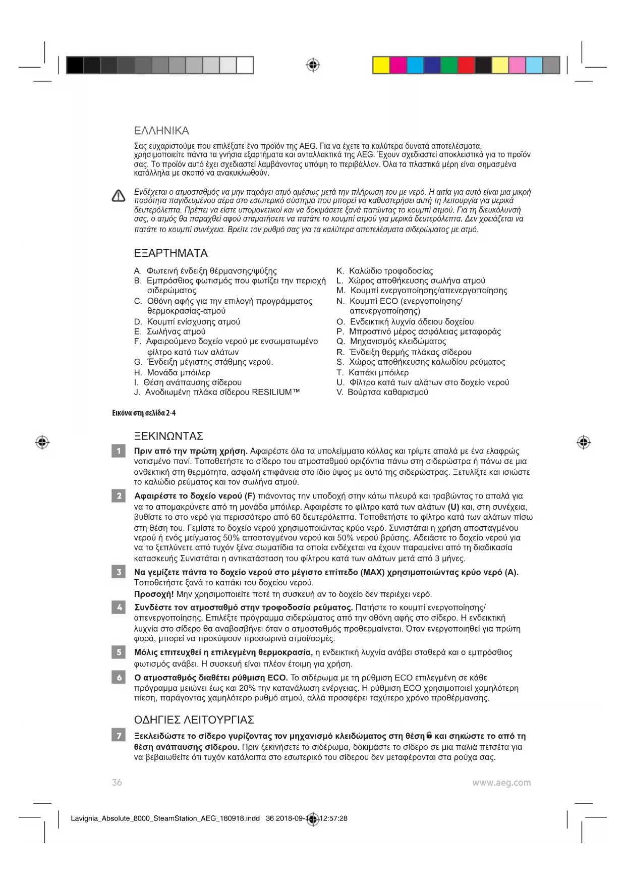 Σας ευχαριστούμε που επιλέξατε ένα προϊόν της AEG. Για να έχετε τα καλύτερα δυνατά αποτελέσματα, χρησιμοποιείτε πάντα τα γνήσια εξαρτήματα και ανταλλακτικά της AEG. Έχουν σχεδιαστεί αποκλειστικά για το προϊόν σας. Το προϊόν αυτό έχει σχεδιαστεί λαμβάνοντας υπόψη το περιβάλλον. Όλα τα πλαστικά μέρη είναι σημασμένα κατάλληλα με σκοπό να ανακυκλωθούν. Ενδέχεται ο ατμοσταθμός να μην παράγει ατμό αμέσως μετά την πλήρωση του με νερό. Η αιτία για αυτό είναι μια μικρή ποσότητα παγιδευμένου αέρα στο εσωτερικό σύστημα που μπορεί να καθυστερήσει αυτή τη λειτουργία για μερικά δευτερόλεπτα. Πρέπει να είστε υπομονετικοί και να δοκιμάσετε ξανά πατώντας το κουμπί ατμού. Για τη διευκόλυνσή σας, ο ατμός θα παραχθεί αφού σταματήσετε να πατάτε το κουμπί ατμού για μερικά δευτερόλεπτα. Δεν χρειάζεται να πατάτε το κουμπί συνέχεια. Βρείτε τον ρυθμό σας για τα καλύτερα αποτελέσματα σιδερώματος με ατμό.
