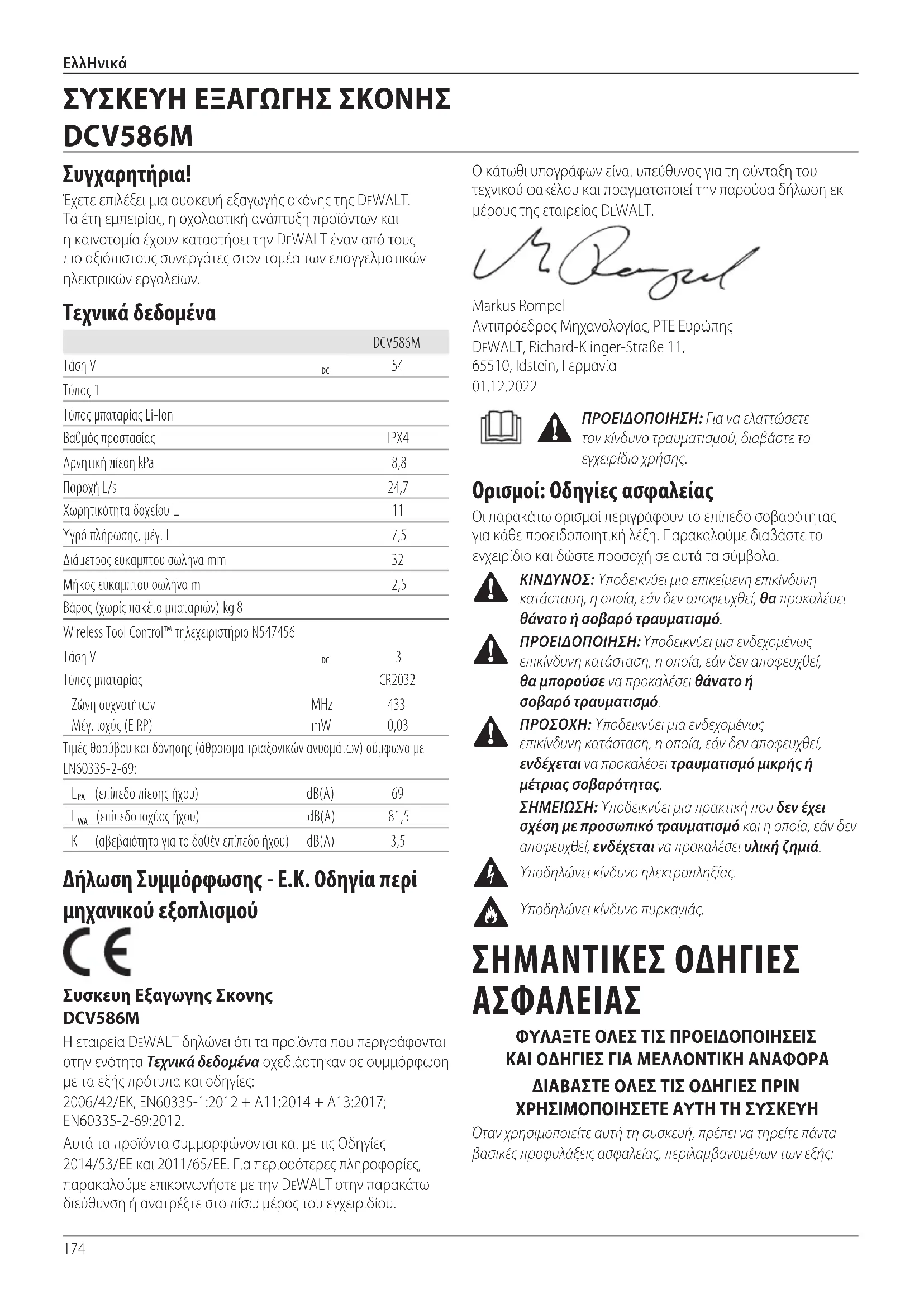 (επίπεδο ισχύος ήχου) dB(A) 81,5 K (αβεβαιότητα για το δοθέν επίπεδο ήχου) dB(A) 3,5 Δήλωση Συμμόρφωσης ‑ Ε.Κ.Οδηγία περί μηχανικού εξοπλισμού Συσκευη Εξαγωγης Σκονης DCV586M Η εταιρεία DeWALT δηλώνει ότι τα προϊόντα που περιγράφονται στην ενότητα Τεχνικά δεδομένα σχεδιάστηκαν σε συμμόρφωση με τα εξής πρότυπα και οδηγίες: 2006/42/eK, EN60335‑1:2012 + A11:2014 + A13:2017; EN60335‑2‑69:2012.Αυτά τα προϊόντα συμμορφώνονται και με τις Οδηγίες 2014/53/EE και 2011/65/ΕΕ. Για περισσότερες πληροφορίες, παρακαλούμε επικοινωνήστε με την DeWALT στην παρακάτω διεύθυνση ή ανατρέξτε στο πίσω μέρος τουεγχειριδίου.Ο κάτωθι υπογράφων είναι υπεύθυνος για τη σύνταξη του τεχνικού φακέλου και πραγματοποιεί την παρούσα δήλωση εκ μέρους της εταιρείαςDeWALT.Markus Rompel Αντιπρόεδρος Μηχανολογίας, PTE Ευρώπης DeWALT, Richard‑Klinger‑Straße 11, 65510, Idstein, Γερμανία 01.12.2022 ΠΡΟΕΙΔΟΠΟΙΗΣΗ: Για να ελαττώσετε τον κίνδυνο τραυματισμού, διαβάστε το εγχειρίδιοχρήσης. Ορισμοί: Οδηγίες ασφαλείας Οι παρακάτω ορισμοί περιγράφουν το επίπεδο σοβαρότητας για κάθε προειδοποιητική λέξη. Παρακαλούμε διαβάστε το εγχειρίδιο και δώστε προσοχή σε αυτά τασύμβολα.