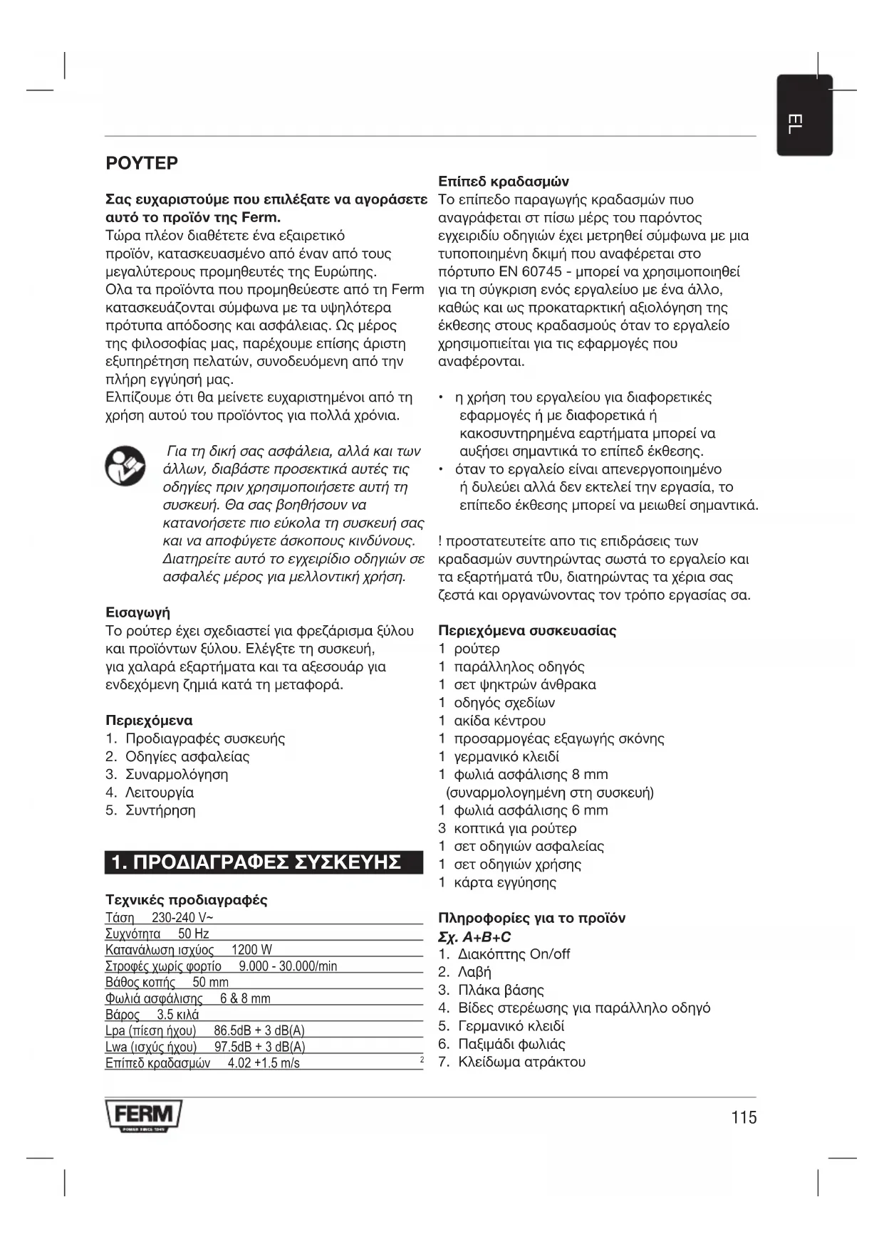 Σας ευχαριστούμε που επιλέξατε να αγοράσετε αυτό το προϊόν της Ferm. Τώρα πλέον διαθέτετε ένα εξαιρετικό προϊόν, κατασκευασμένο από έναν από τους μεγαλύτερους προμηθευτές της Ευρώπης. Ολα τα προϊόντα που προμηθεύεστε από τη Ferm κατασκευάζονται σύμφωνα με τα υψηλότερα πρότυπα απόδοσης και ασφάλειας. Ως μέρος της φιλοσοφίας μας, παρέχουμε επίσης άριστη εξυπηρέτηση πελατών, συνοδευόμενη από την πλήρη εγγύησή μας. Ελπίζουμε ότι θα μείνετε ευχαριστημένοι από τη χρήση αυτού του προϊόντος για πολλά χρόνια. Γιατηδικήσαςασφάλεια,αλλάκαιτων άλλων,διαβάστεπροσεκτικάαυτέςτις οδηγίεςπρινχρησιμοποιήσετεαυτήτη συσκευή.Θασαςβοηθήσουννα κατανοήσετεπιοεύκολατησυσκευήσας καινααποφύγετεάσκοπουςκινδύνους. Διατηρείτεαυτότοεγχειρίδιοοδηγιώνσε ασφαλέςμέροςγιαμελλοντικήχρήση.