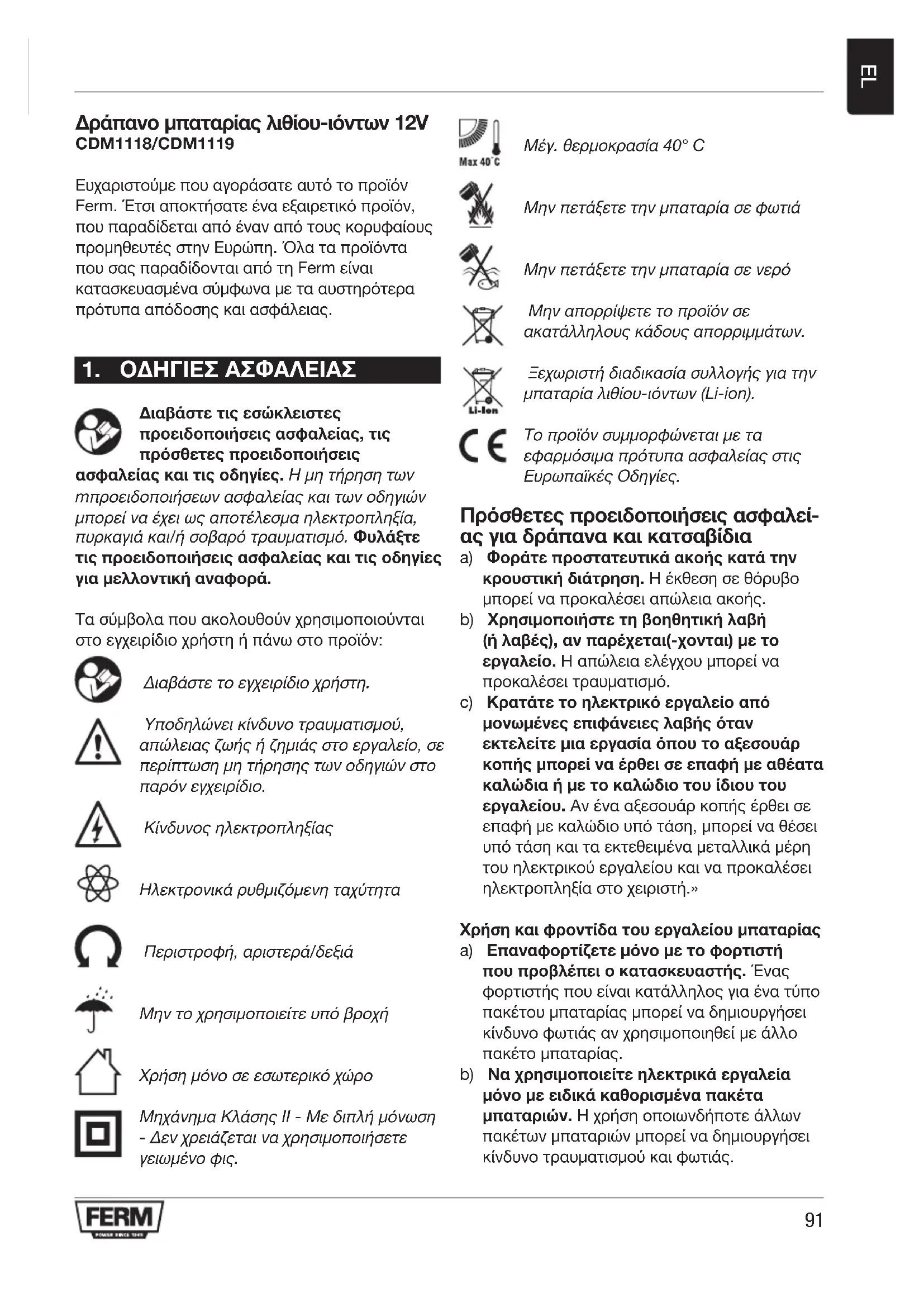 Δράπανο μπαταρίας λιθίου-ιόντων 12V CDM1118/CDM1119 Ευχαριστούμε που αγοράσατε αυτό το προϊόν Ferm. Έτσι αποκτήσατε ένα εξαιρετικό προϊόν, που παραδίδεται από έναν από τους κορυφαίους προμηθευτές στην Ευρώπη. Όλα τα προϊόντα που σας παραδίδονται από τη Ferm είναι κατασκευασμένα σύμφωνα με τα αυστηρότερα πρότυπα απόδοσης και ασφάλειας.