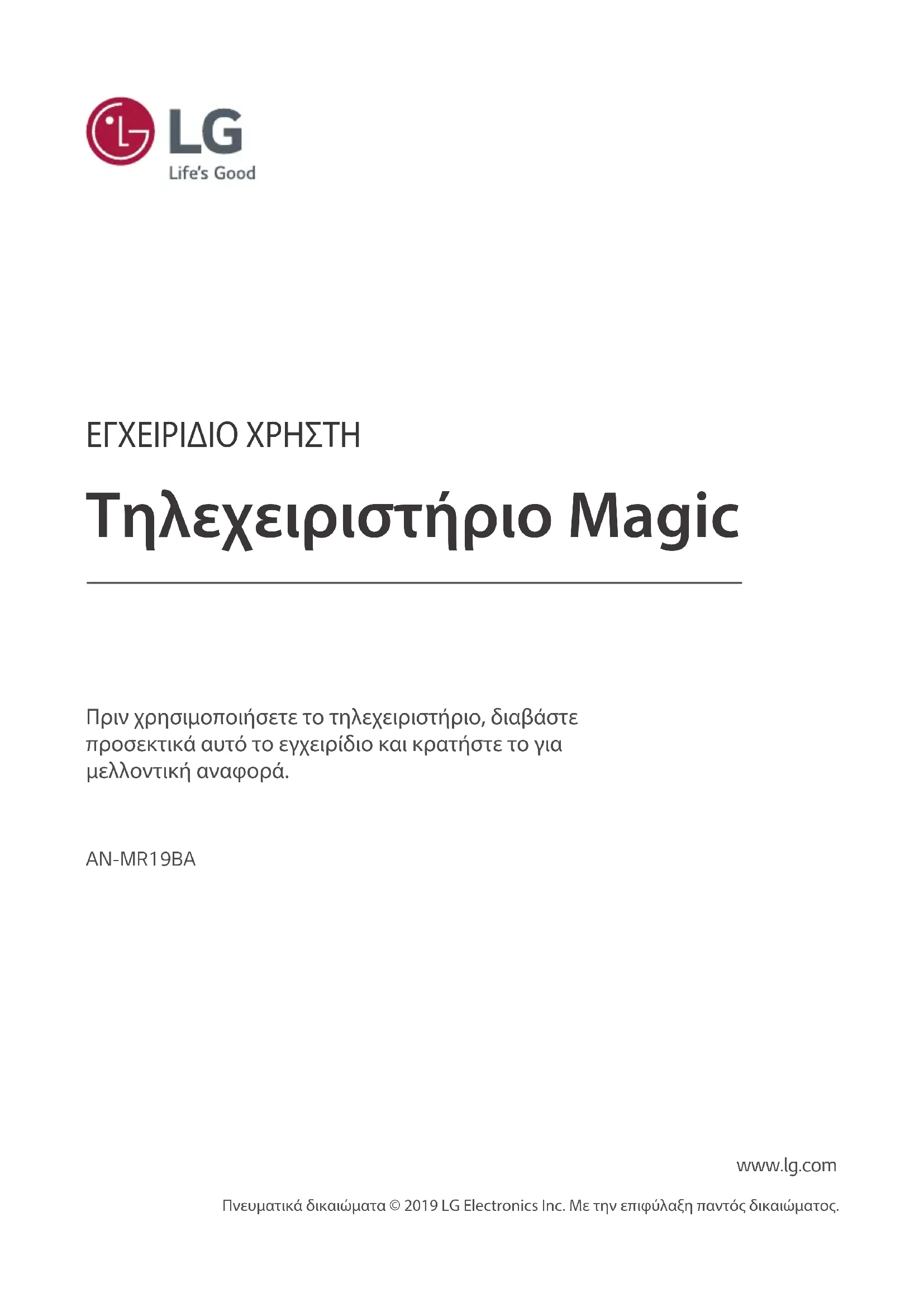 Modell-Nr. AN-MR19BA Frequenzbereich 2,400 bis 2,4835 GHz Ausgangsleistung (max.) 4dBm Kanal 40Kanäle Stromversorgung 2 Alkali-Batterien (1,5 Volt, AA) Betriebstemperaturbereich 0 °C bis 40 °CAN-MR19BA Πριν χρησιμοποιήσετε το τηλεχειριστήριο, διαβάστε προσεκτικά αυτό το εγχειρίδιο και κρατήστε το για μελλοντική αναφορά. Τηλεχειριστήριο Magic ΕΓΧΕΙΡΙΔΙΟ ΧΡΗΣΤΗ www.lg.com Πνευματικά δικαιώματα © 2019 LG Electronics Inc. Με την επιφύλαξη παντός δικαιώματος.2