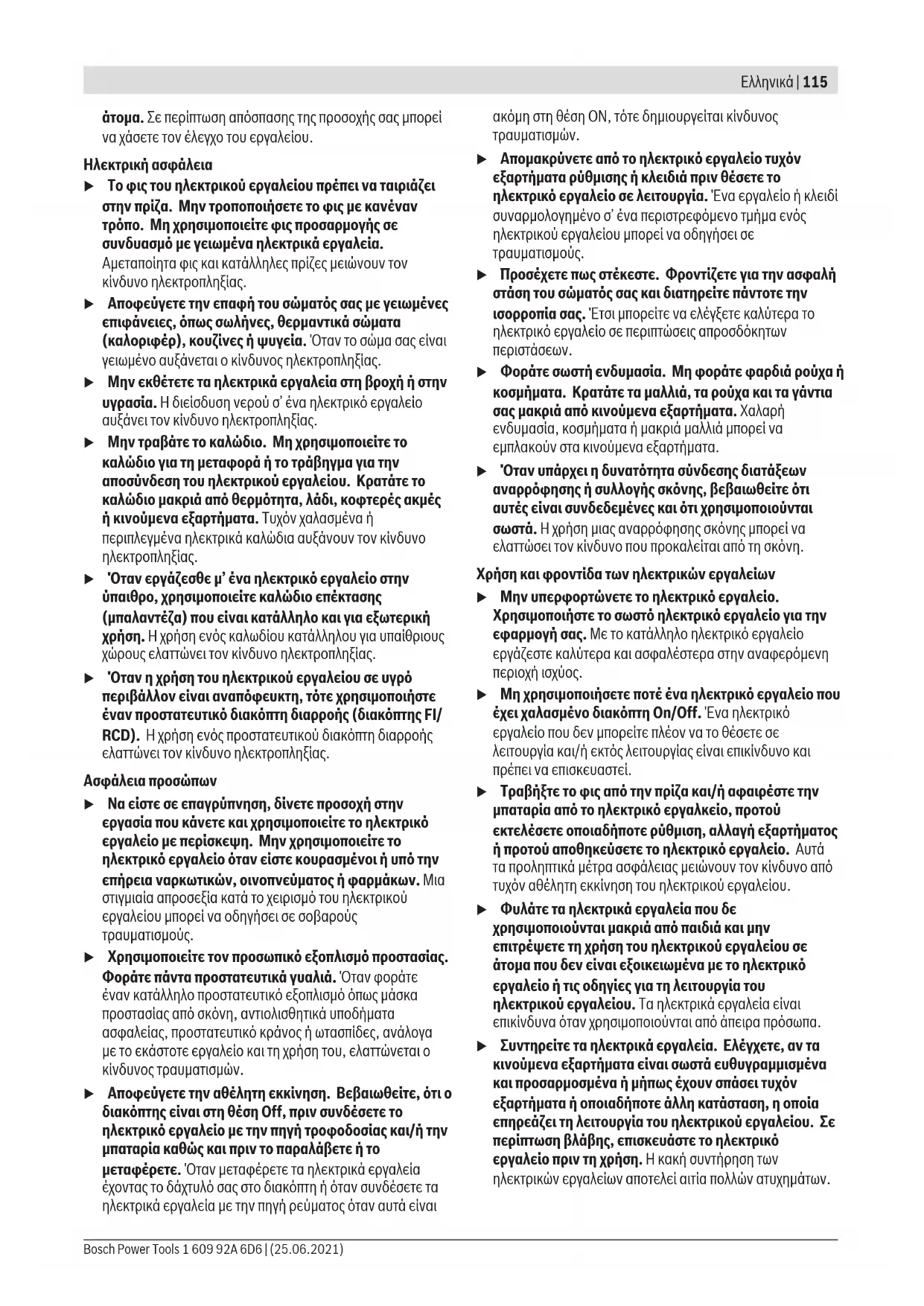 u Μην εργάζεστε με το ηλεκτρικό εργαλείο σε περιβάλλον, όπου υπάρχει κίνδυνος έκρηξης, όπως με την παρουσία εύφλεκτων υγρών, αερίων ή σκόνης. Τα ηλεκτρικά εργαλεία δημιουργούν σπινθηρισμό ο οποίος μπορεί να αναφλέξει τη σκόνη ή τις αναθυμιάσεις. u Όταν χρησιμοποιείτε το ηλεκτρικό εργαλείο, κρατάτε μακριά τα παιδιά και άλλα τυχόν παρευρισκόμενα 1 609 92A 6D6 | (25.06.2021) Bosch Power ToolsΕλληνικά | 115 άτομα. Σε περίπτωση απόσπασης της προσοχής σας μπορεί να χάσετε τον έλεγχο του εργαλείου. Ηλεκτρική ασφάλεια u Το φις του ηλεκτρικού εργαλείου πρέπει να ταιριάζει στην πρίζα. Μην τροποποιήσετε το φις με κανέναν τρόπο. Μη χρησιμοποιείτε φις προσαρμογής σε συνδυασμό με γειωμένα ηλεκτρικά εργαλεία. Αμεταποίητα φις και κατάλληλες πρίζες μειώνουν τον κίνδυνο ηλεκτροπληξίας. u Αποφεύγετε την επαφή του σώματός σας με γειωμένες επιφάνειες, όπως σωλήνες, θερμαντικά σώματα (καλοριφέρ), κουζίνες ή ψυγεία. Όταν το σώμα σας είναι γειωμένο αυξάνεται ο κίνδυνος ηλεκτροπληξίας. u Μην εκθέτετε τα ηλεκτρικά εργαλεία στη βροχή ή στην υγρασία. Η διείσδυση νερού σ’ ένα ηλεκτρικό εργαλείο αυξάνει τον κίνδυνο ηλεκτροπληξίας. u Μην τραβάτε το καλώδιο. Μη χρησιμοποιείτε το καλώδιο για τη μεταφορά ή το τράβηγμα για την αποσύνδεση του ηλεκτρικού εργαλείου. Κρατάτε το καλώδιο μακριά από θερμότητα, λάδι, κοφτερές ακμές ή κινούμενα εξαρτήματα. Τυχόν χαλασμένα ή περιπλεγμένα ηλεκτρικά καλώδια αυξάνουν τον κίνδυνο ηλεκτροπληξίας. u Όταν εργάζεσθε μ’ ένα ηλεκτρικό εργαλείο στην ύπαιθρο, χρησιμοποιείτε καλώδιο επέκτασης (μπαλαντέζα) που είναι κατάλληλο και για εξωτερική χρήση. Ηχρήση ενός καλωδίου κατάλληλου για υπαίθριους χώρους ελαττώνει τον κίνδυνο ηλεκτροπληξίας. u Όταν η χρήση του ηλεκτρικού εργαλείου σε υγρό περιβάλλον είναι αναπόφευκτη, τότε χρησιμοποιήστε έναν προστατευτικό διακόπτη διαρροής (διακόπτηςFI/ RCD). Ηχρήση ενός προστατευτικού διακόπτη διαρροής ελαττώνει τον κίνδυνο ηλεκτροπληξίας. Ασφάλεια προσώπων u Να είστε σε επαγρύπνηση, δίνετε προσοχή στην εργασία που κάνετε και χρησιμοποιείτε το ηλεκτρικό εργαλείο με περίσκεψη. Μην χρησιμοποιείτε το ηλεκτρικό εργαλείο όταν είστε κουρασμένοι ή υπό την επήρεια ναρκωτικών, οινοπνεύματος ή φαρμάκων. Μια στιγμιαία απροσεξία κατά το χειρισμό του ηλεκτρικού εργαλείου μπορεί να οδηγήσει σε σοβαρούς τραυματισμούς. u Χρησιμοποιείτε τον προσωπικό εξοπλισμό προστασίας. Φοράτε πάντα προστατευτικά γυαλιά. Όταν φοράτε έναν κατάλληλο προστατευτικό εξοπλισμό όπως μάσκα προστασίας από σκόνη, αντιολισθητικά υποδήματα ασφαλείας, προστατευτικό κράνος ή ωτασπίδες, ανάλογα με το εκάστοτε εργαλείο και τη χρήση του, ελαττώνεται ο κίνδυνος τραυματισμών. u Αποφεύγετε την αθέλητη εκκίνηση. Βεβαιωθείτε, ότι ο διακόπτης είναι στη θέση Off, πριν συνδέσετε το ηλεκτρικό εργαλείο με την πηγή τροφοδοσίας και/ή την μπαταρία καθώς και πριν το παραλάβετε ή το μεταφέρετε. Όταν μεταφέρετε τα ηλεκτρικά εργαλεία έχοντας το δάχτυλό σας στο διακόπτη ή όταν συνδέσετε τα ηλεκτρικά εργαλεία με την πηγή ρεύματος όταν αυτά είναι ακόμη στη θέση ΟΝ, τότε δημιουργείται κίνδυνος τραυματισμών. u Απομακρύνετε από το ηλεκτρικό εργαλείο τυχόν εξαρτήματα ρύθμισης ή κλειδιά πριν θέσετε το ηλεκτρικό εργαλείο σε λειτουργία. Ένα εργαλείο ή κλειδί συναρμολογημένο σ’ ένα περιστρεφόμενο τμήμα ενός ηλεκτρικού εργαλείου μπορεί να οδηγήσει σε τραυματισμούς. u Προσέχετε πως 