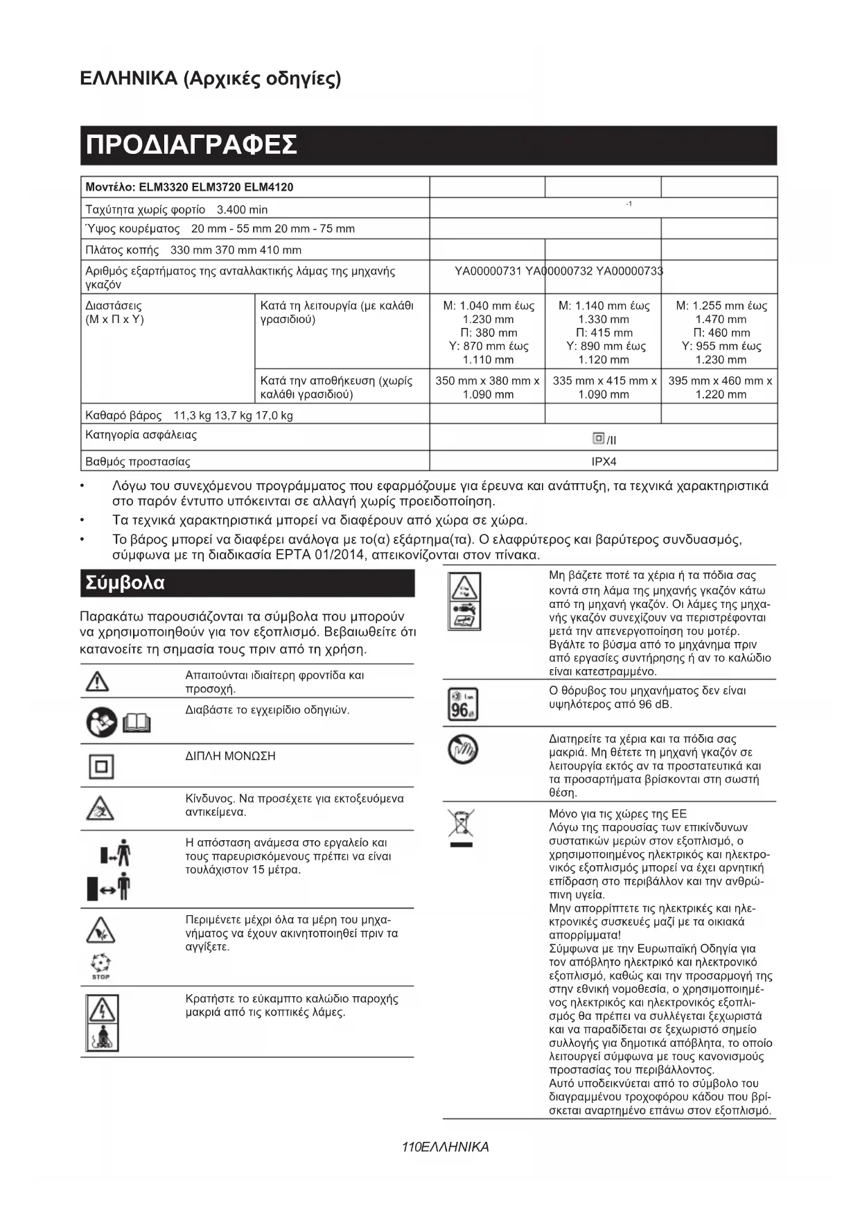 Ύψοςκουρέματος 20 mm - 55 mm 20 mm - 75 mm Πλάτοςκοπής 330 mm 370 mm 410 mm Αριθμόςεξαρτήματοςτηςανταλλακτικήςλάμαςτηςμηχανής