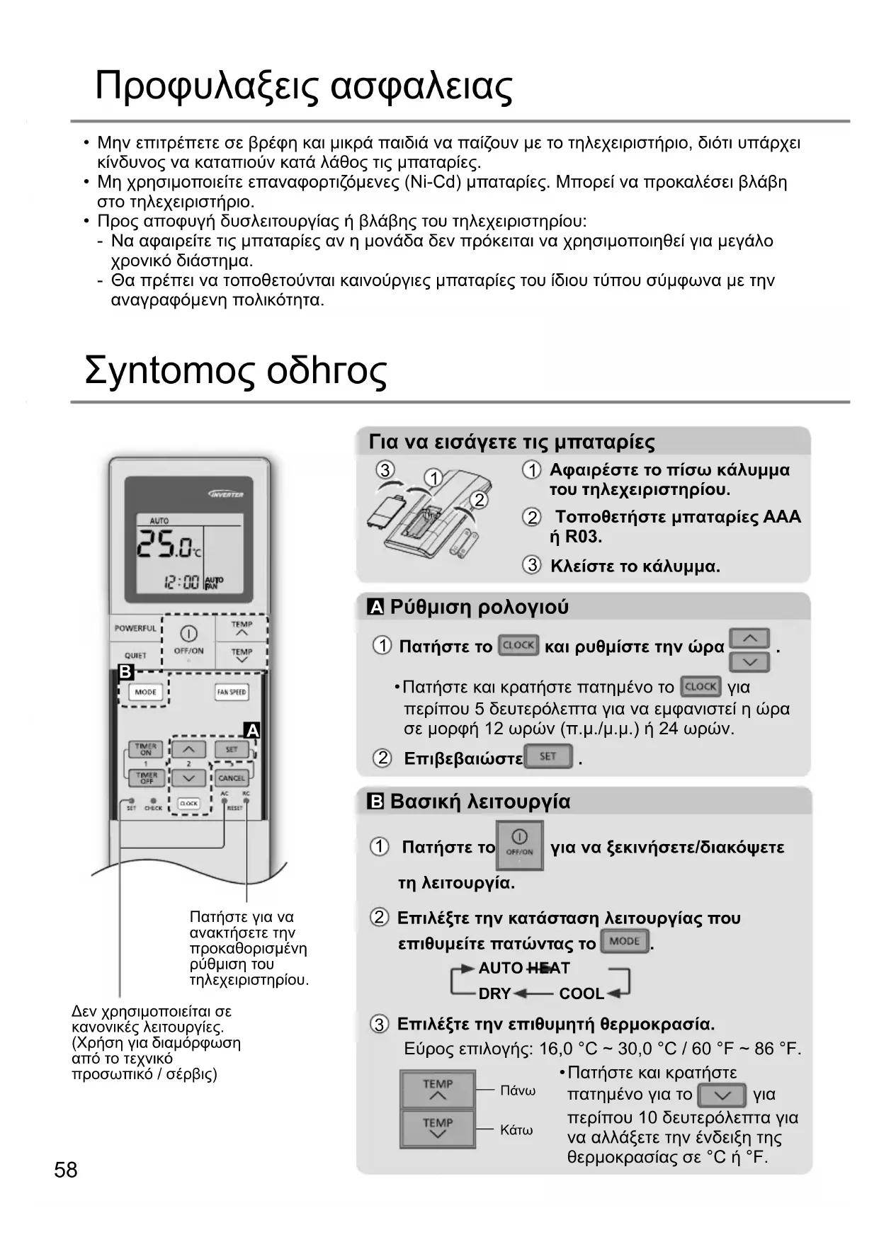 περίπου 10 δευτερόλεπτα για να αλλάξετε την ένδειξη της θερμοκρασίας σε °C ή °F. Σyntomoς oδhгoς59 Για τη ρύθμιση της ταχύτητας ανεμιστήρα