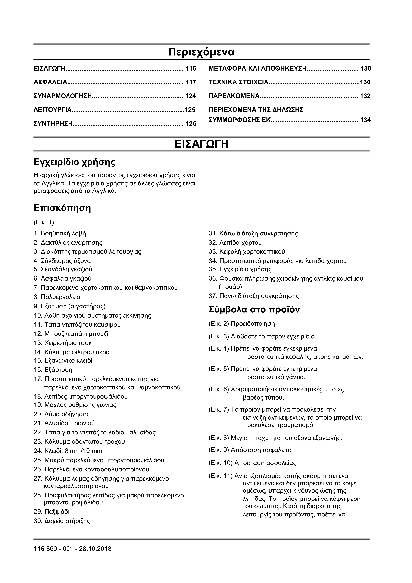Σύμβολα στο προϊόν (Εικ. 2) Προειδοποίηση (Εικ. 3) Διαβάστε το παρόν εγχειρίδιο (Εικ. 4) Πρέπει να φοράτε εγκεκριμένα προστατευτικά κεφαλής, ακοής και ματιών. (Εικ. 5) Πρέπει να φοράτε εγκεκριμένα προστατευτικά γάντια. (Εικ. 6) Χρησιμοποιήστε αντιολισθητικές μπότες βαρέος τύπου. (Εικ. 7) Το προϊόν μπορεί να προκαλέσει την εκτίναξη αντικειμένων, το οποίο μπορεί να προκαλέσει τραυματισμό. (Εικ. 8) Μέγιστη ταχύτητα του άξονα εξαγωγής. (Εικ. 9) Απόσταση ασφαλείας (Εικ. 10) Απόσταση ασφαλείας (Εικ. 11) Αν ο εξοπλισμός κοπής ακουμπήσει ένα αντικείμενο και δεν μπορέσει να το κόψει αμέσως, υπάρχει κίνδυνος ώσης της λεπίδας. Το προϊόν μπορεί να κόψει μέρη του σώματος. Κατά τη διάρκεια της λειτουργίς του προϊόντος, πρέπει να 116 860 - 001 - 28.10.2018διατηρείτε μια ελάχιστη απόσταση 15 m (50 ft) από ανθρώπους και ζώα. (Εικ. 12) Βεβαιωθείτε ότι εάν έχετε μακριά μαλλιά, βρίσκονται πάνω από τους ώμους σας. (Εικ. 13) Τα βέλη δείχνουν τα όρια για τη θέση της