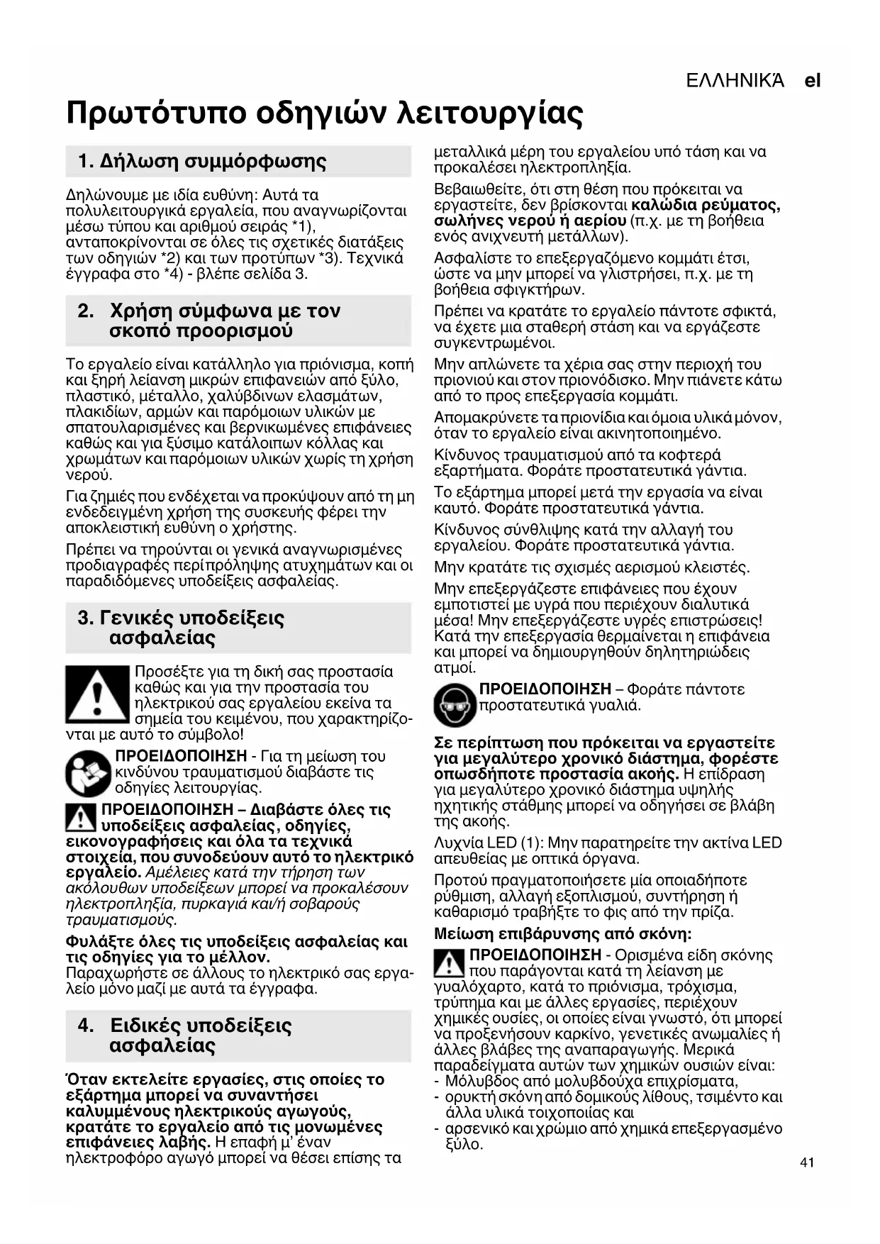 Για ζημιές που ενδέχεται να προκύψουν από τη μη ενδεδειγμένη χρήση της συσκευής φέρει την αποκλειστική ευθύνη ο χρήστης. Πρέπει να τηρούνται οι γενικά αναγνωρισμένες προδιαγραφές περί πρόληψης ατυχημάτων και οι παραδιδόμενες υποδείξεις ασφαλείας. Προσέξτε για τη δική σας προστασία καθώς και για την προστασία του ηλεκτρικού σας εργαλείου εκείνα τα σημεία του κειμένου, που χαρακτηρίζο- νται με αυτό το σύμβολο! ΠΡΟΕΙΔΟΠΟΙΗΣΗ - Για τη μείωση του κινδύνου τραυματισμού διαβάστε τις οδηγίες λειτουργίας. ΠΡΟΕΙΔΟΠΟΙΗΣΗ – Διαβάστε όλες τις υποδείξεις ασφαλείας