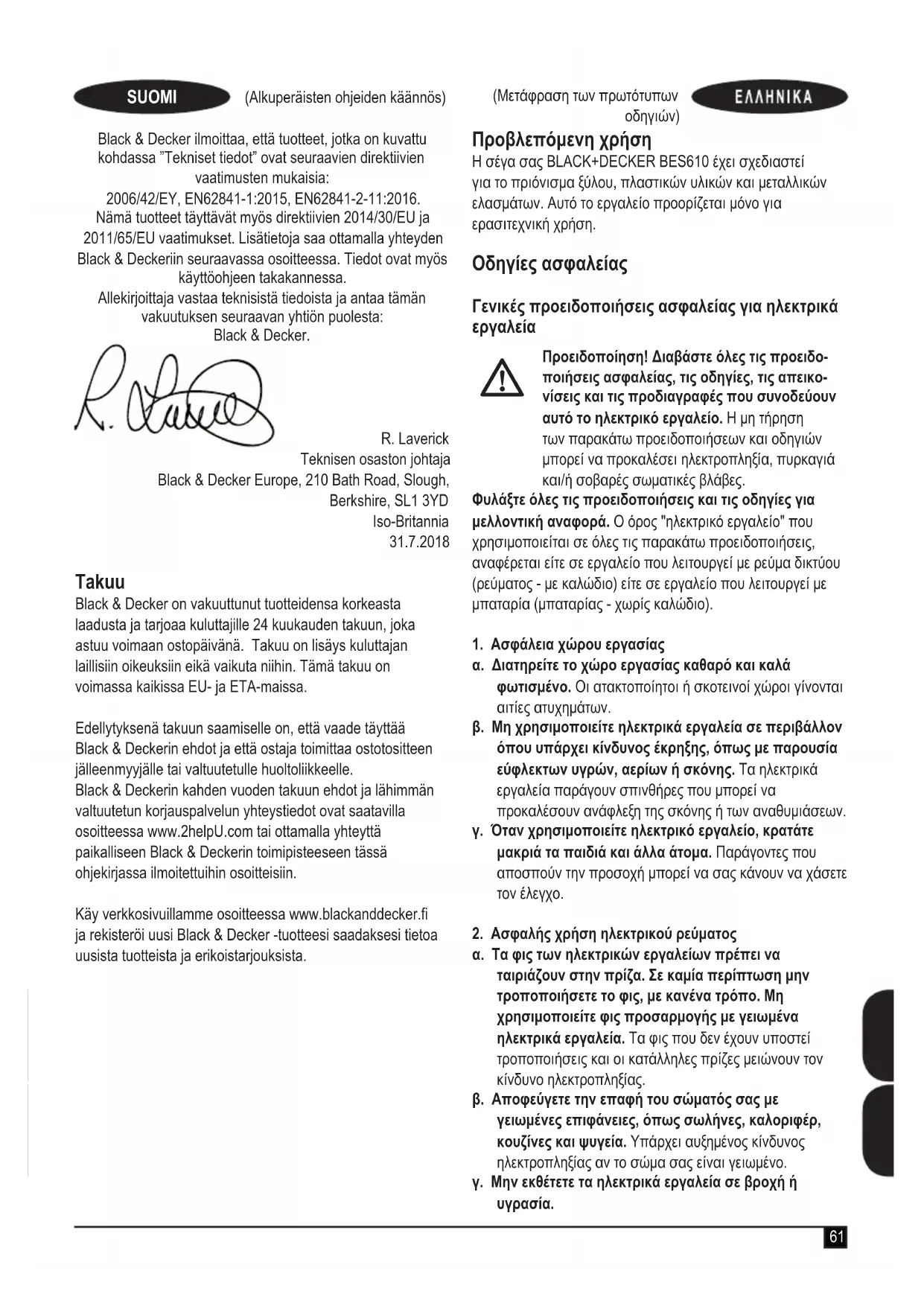 BES610 Σέγα67 (Μετάφραση των πρωτότυπων οδηγιών) Η Black & Decker δηλώνει ότι τα προϊόντα αυτά που περιγράφονται στα "τεχνικά δεδομένα" συμμορφώνονται με τα ακόλουθα: 2006/42/ΕΚ, EN62841-1:2015, EN62841-2-11:2016. Αυτά τα προϊόντα συμμορφώνονται και με την Οδηγία 2014/30/ΕΕ και 2011/65/ΕΕ. Για περισσότερες πληροφορίες, επικοινωνήστε με την Black & Decker στην παρακάτω διεύθυνση ή ανατρέξτε στο πίσω μέρος του εγχειριδίου. Ο κάτωθι υπογεγραμμένος είναι υπεύθυνος για την κατάρτιση του τεχνικού φακέλου και κάνει αυτή τη δήλωση για λογαριασμό της Black & Decker. R. Laverick Διευθυντής Σχεδιασμού Black & Decker Europe, 210 Bath Road, Slough, Berkshire, SL1 3YD United Kingdom (Ηνωμένο Βασίλειο) 31/07/2018