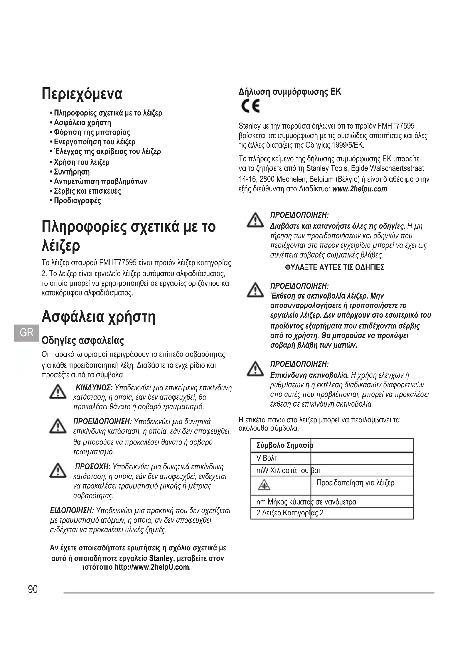 το οποίο μπορεί να χρησιμοποιηθεί σε εργασίες οριζόντιου και κατακόρυφου αλφαδιάσματος. Ασφάλεια χρήστη Οδηγίες ασφαλείας Οι παρακάτω ορισμοί περιγράφουν το επίπεδο σοβαρότητας για κάθε προειδοποιητική λέξη. Διαβάστε το εγχειρίδιο και προσέξτε αυτά τα σύμβολα. ΚΙΝΔΥΝΟΣ: Υποδεικνύει μια επικείμενη επικίνδυνη κατάσταση, η οποία, εάν δεν αποφευχθεί, θα προκαλέσει θάνατο ή σοβαρό τραυματισμό. ΠΡΟΕΙΔΟΠΟΙΗΣΗ: Υποδεικνύει μια δυνητικά επικίνδυνη κατάσταση, η οποία, εάν δεν αποφευχθεί, θα μπορούσε να προκαλέσει θάνατο ή σοβαρό τραυματισμό. ΠΡΟΣΟΧΗ: Υποδεικνύει μια δυνητικά επικίνδυνη κατάσταση, η οποία, εάν δεν αποφευχθεί, ενδέχεται να προκαλέσει τραυματισμό μικρής ή μέτριας σοβαρότητας. ΕΙΔΟΠΟΙΗΣΗ: Υποδεικνύει μια πρακτική που δεν σχετίζεται με τραυματισμό ατόμων, η οποία, αν δεν αποφευχθεί, ενδέχεται να προκαλέσει υλικές ζημιές. Αν έχετε οποιεσδήποτε ερωτήσεις η σχόλια σχετικά με αυτό ή οποιοδήποτε εργαλείο Stanley, μεταβείτε στον ιστότοπο http://www.2helpU.com. Δήλωση συμμόρφωσης ΕΚ Stanley με την παρούσα δηλώνει ότι το προϊόν FMHT77595 βρίσκεται σε συμμόρφωση με τις ουσιώδεις απαιτήσεις και όλες τις άλλες διατάξεις της Οδηγίας 1999/5/ΕΚ. Το πλήρες κείμενο της δήλωσης συμμόρφωσης ΕΚ μπορείτε να το ζητήσετε από τη Stanley Tools, Egide Walschaertsstraat 14-16, 2800 Mechelen, Belgium (Βέλγιο) ή είναι διαθέσιμο στην εξής διεύθυνση στο Διαδίκτυο: www.2helpu.com. ΠΡΟΕΙΔΟΠΟΙΗΣΗ: Διαβάστε και κατανοήστε όλες τις οδηγίες. Η μη τήρηση των προειδοποιήσεων και οδηγιών που περιέχονται στο παρόν εγχειρίδιο μπορεί να έχει ως συνέπεια σοβαρές σωματικές βλάβες. ΦΥΛΑΞΤΕ ΑΥΤΕΣ ΤΙΣ ΟΔΗΓΙΕΣ ΠΡΟΕΙΔΟΠΟΙΗΣΗ: Έκθεση σε ακτινοβολία λέιζερ. Μην αποσυναρμολογήσετε ή τροποποιήσετε το εργαλείο λέιζερ. Δεν υπάρχουν στο εσωτερικό του προϊόντος εξαρτήματα που επιδέχονται σέρβις από το χρήστη. Θα μπορούσε να προκύψει σοβαρή βλάβη των ματιών. ΠΡΟΕΙΔΟΠΟΙΗΣΗ: Επικίνδυνη ακτινοβολία. Η χρήση ελέγχων ή ρυθμίσεων ή η εκτέλεση διαδικασιών διαφορετικών από αυτές που προβλέπονται, μπορεί να προκαλέσει έκθεση σε επικίνδυνη ακτινοβολία. Η ετικέτα πάνω στο λέιζερ μπορεί να περιλαμβάνει τα ακόλουθα σύμβολα. Σύμβολο Σημασία V Βολτ mW Χιλιοστά του βατ Προειδοποίηση για λέιζερ nm Μήκος κύματος σε νανόμετρα 2 Λέιζερ Κατηγορίας 291