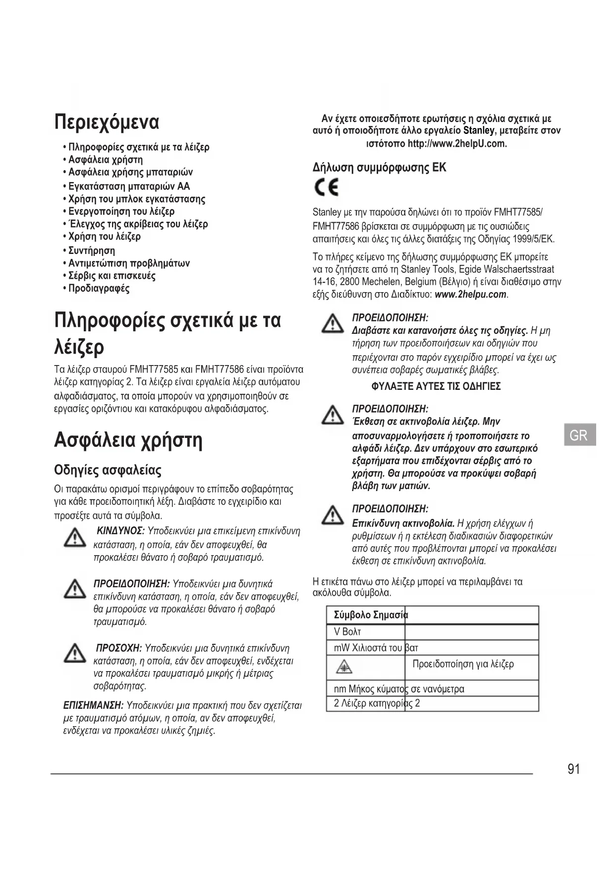 Προειδοποιητικές ετικέτες Για την ευκολία και την ασφάλειά σας, πάνω στο λέιζερ υπάρχουν οι παρακάτω ετικέτες. ΠΡΟΕΙΔΟΠΟΙΗΣΗ: Για να μειωθεί ο κίνδυνος τραυματισμού, ο χρήστης πρέπει να διαβάσει το εγχειρίδιο οδηγιών. ΠΡΟΕΙΔΟΠΟΙΗΣΗ: ΑΚΤΙΝΟΒΟΛΙΑ ΛΕΙΖΕΡ. ΜΗΝ ΚΟΙΤΑΖΕΤΕ ΜΕΣΑ ΣΤΗΝ ΑΚΤΙΝΑ. Προϊόν λέιζερ Κατηγορίας 2. www.STANLEYTOOLS.com FMHT77585 www.STANLEYTOOLS.com FMHT77585