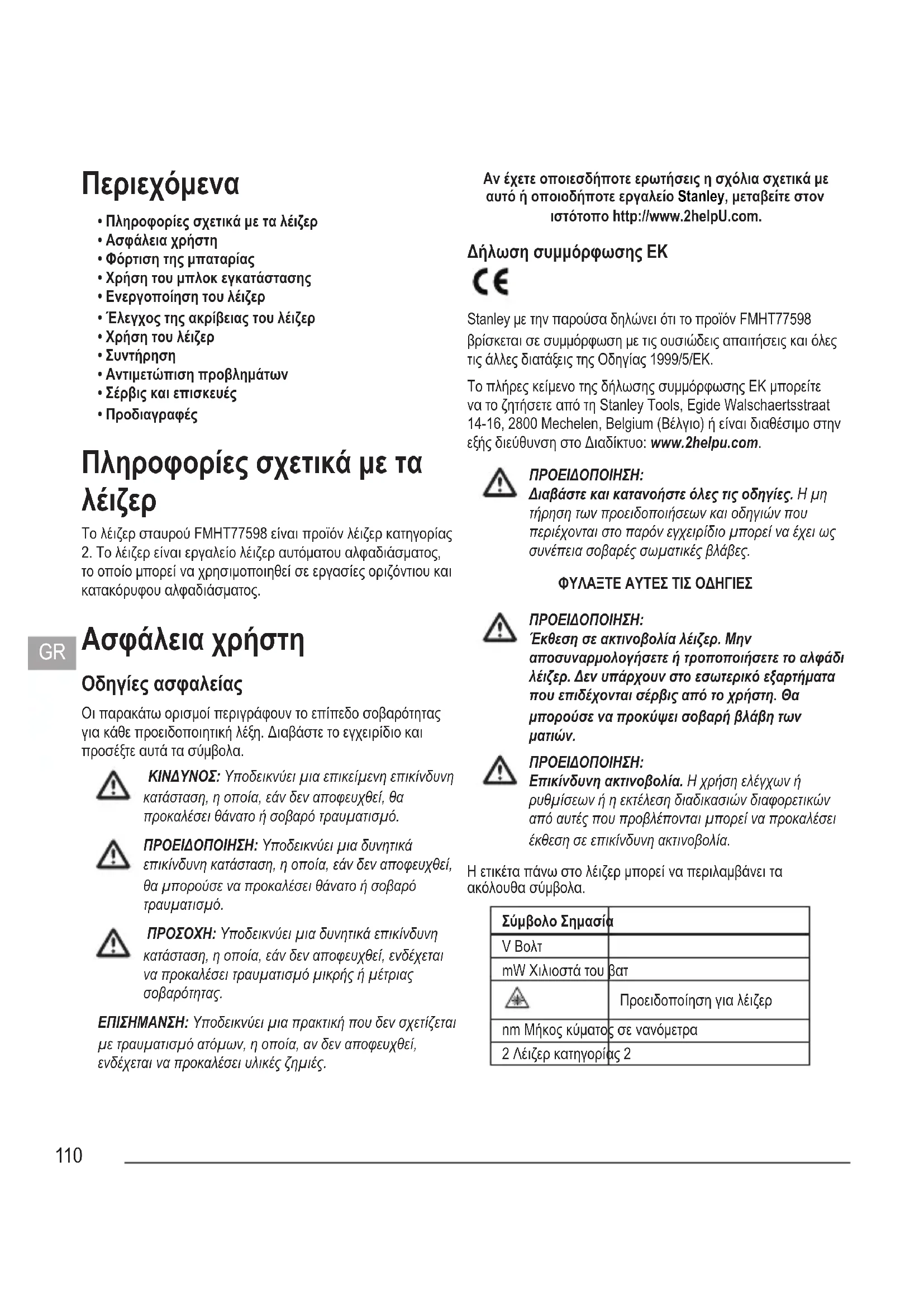 το οποίο μπορεί να χρησιμοποιηθεί σε εργασίες οριζόντιου και κατακόρυφου αλφαδιάσματος. Ασφάλεια χρήστη Οδηγίες ασφαλείας Οι παρακάτω ορισμοί περιγράφουν το επίπεδο σοβαρότητας για κάθε προειδοποιητική λέξη. Διαβάστε το εγχειρίδιο και προσέξτε αυτά τα σύμβολα. ΚΙΝΔΥΝΟΣ: Υποδεικνύει μια επικείμενη επικίνδυνη κατάσταση, η οποία, εάν δεν αποφευχθεί, θα προκαλέσει θάνατο ή σοβαρό τραυματισμό. ΠΡΟΕΙΔΟΠΟΙΗΣΗ: Υποδεικνύει μια δυνητικά επικίνδυνη κατάσταση, η οποία, εάν δεν αποφευχθεί, θα μπορούσε να προκαλέσει θάνατο ή σοβαρό τραυματισμό. ΠΡΟΣΟΧΗ: Υποδεικνύει μια δυνητικά επικίνδυνη κατάσταση, η οποία, εάν δεν αποφευχθεί, ενδέχεται να προκαλέσει τραυματισμό μικρής ή μέτριας σοβαρότητας. ΕΠΙΣΗΜΑΝΣΗ: Υποδεικνύει μια πρακτική που δεν σχετίζεται με τραυματισμό ατόμων, η οποία, αν δεν αποφευχθεί, ενδέχεται να προκαλέσει υλικές ζημιές. Αν έχετε οποιεσδήποτε ερωτήσεις η σχόλια σχετικά με αυτό ή οποιοδήποτε εργαλείο Stanley, μεταβείτε στον ιστότοπο http://www.2helpU.com. Δήλωση συμμόρφωσης ΕΚ Stanley με την παρούσα δηλώνει ότι το προϊόν FMHT77598 βρίσκεται σε συμμόρφωση με τις ουσιώδεις απαιτήσεις και όλες τις άλλες διατάξεις της Οδηγίας 1999/5/ΕΚ. Το πλήρες κείμενο της δήλωσης συμμόρφωσης ΕΚ μπορείτε να το ζητήσετε από τη Stanley Tools, Egide Walschaertsstraat 14-16, 2800 Mechelen, Belgium (Βέλγιο) ή είναι διαθέσιμο στην εξής διεύθυνση στο Διαδίκτυο: www.2helpu.com. ΠΡΟΕΙΔΟΠΟΙΗΣΗ: Διαβάστε και κατανοήστε όλες τις οδηγίες. Η μη τήρηση των προειδοποιήσεων και οδηγιών που περιέχονται στο παρόν εγχειρίδιο μπορεί να έχει ως συνέπεια σοβαρές σωματικές βλάβες. ΦΥΛΑΞΤΕ ΑΥΤΕΣ ΤΙΣ ΟΔΗΓΙΕΣ ΠΡΟΕΙΔΟΠΟΙΗΣΗ: Έκθεση σε ακτινοβολία λέιζερ. Μην αποσυναρμολογήσετε ή τροποποιήσετε το αλφάδι λέιζερ. Δεν υπάρχουν στο εσωτερικό εξαρτήματα που επιδέχονται σέρβις από το χρήστη. Θα μπορούσε να προκύψει σοβαρή βλάβη των