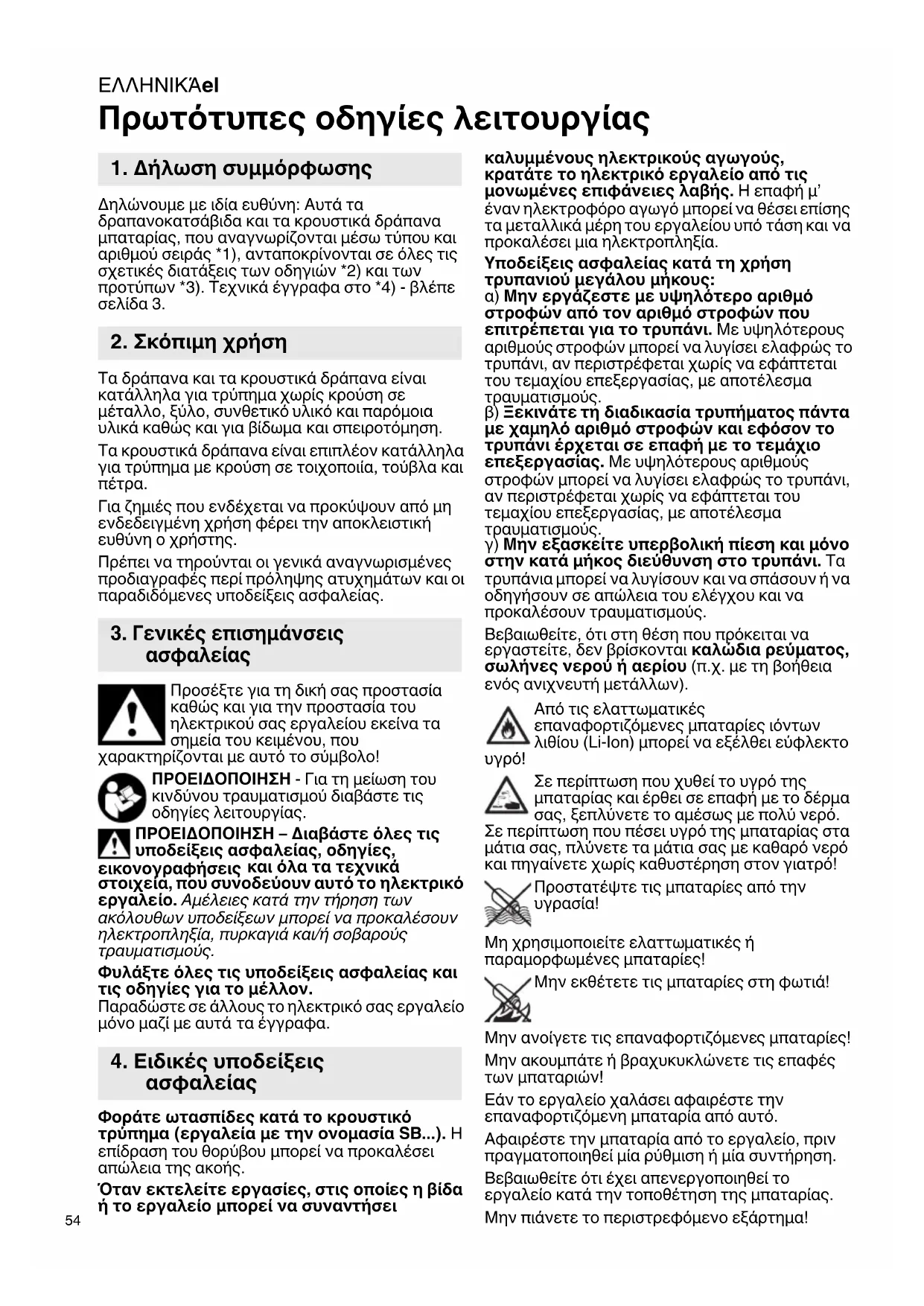 Πρωτότυπες οδηγίες λειτουργίας Δηλώνουμε με ιδία ευθύνη: Αυτά τα δραπανοκατσάβιδα και τα κρουστικά δράπανα μπαταρίας, που αναγνωρίζονται μέσω τύπου και αριθμού σειράς *1), ανταποκρίνονται σε όλες τις σχετικές διατάξεις των οδηγιών *2) και των προτύπων *3). Τεχνικά έγγραφα στο *4) - βλέπε σελίδα 3. Τα δράπανα και τα κρουστικά δράπανα είναι κατάλληλα για τρύπημα χωρίς κρούση σε μέταλλο, ξύλο, συνθετικό υλικό και παρόμοια υλικά καθώς και για βίδωμα και σπειροτόμηση. Τα κρουστικά δράπανα είναι επιπλέον κατάλληλα για τρύπημα με κρούση σε τοιχοποιία, τούβλα και