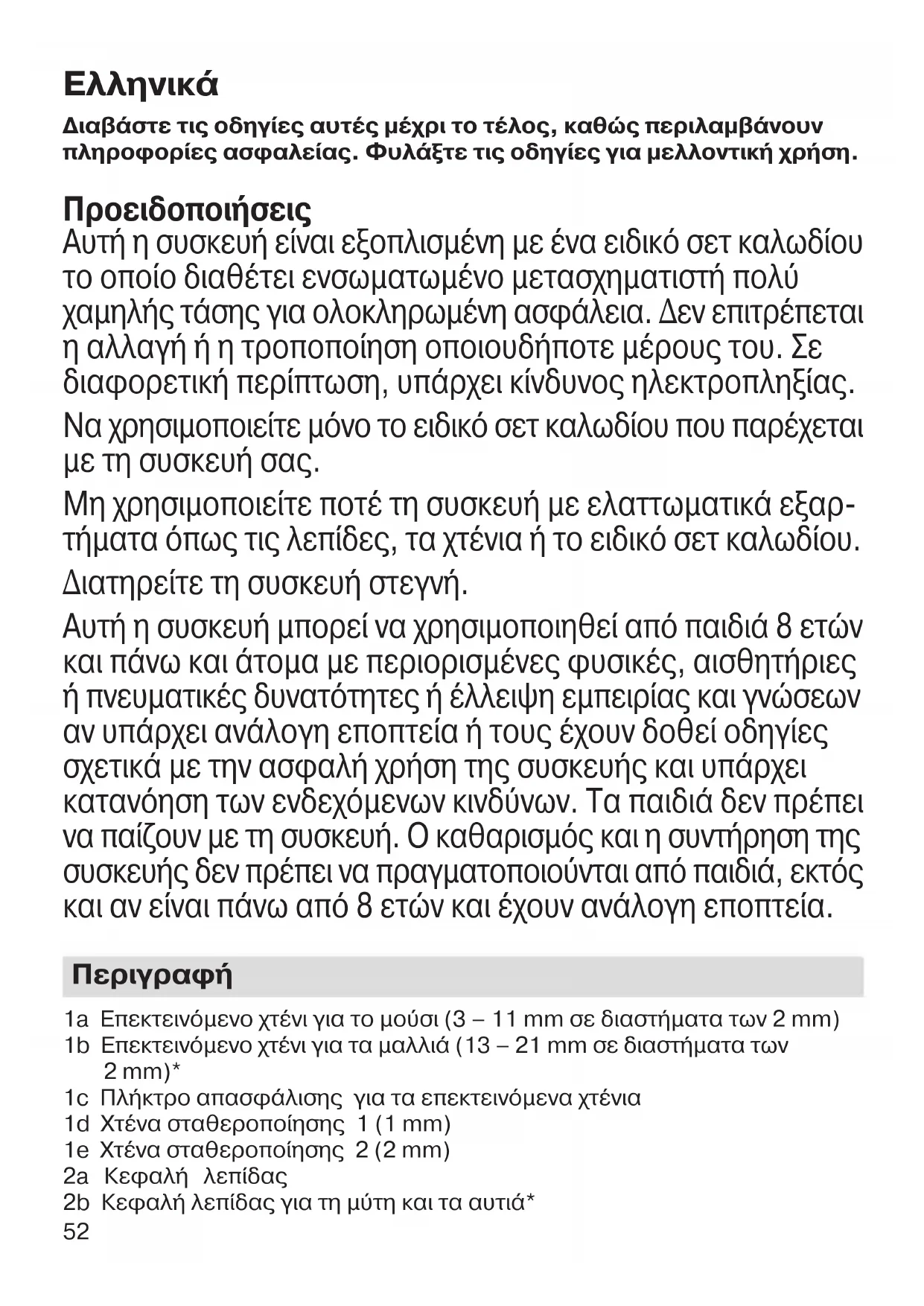 Διαβάστε τις οδηγίες αυτές μέχρι το τέλος, καθώς περιλαμβάνουν πληροφορίες ασφαλείας. Φυλάξτε τις οδηγίες για μελλοντική χρήση. Προειδοποιήσεις Αυτή η συσκευή είναι εξοπλισμένη με ένα ειδικό σετ καλωδίου το οποίο διαθέτει ενσωματωμένο μετασχηματιστή πολύ χαμηλής τάσης για ολοκληρωμένη ασφάλεια. Δεν επιτρέπεται η αλλαγή ή η τροποποίηση οποιουδήποτε μέρους του. Σε διαφορετική περίπτωση, υπάρχει κίνδυνος ηλεκτροπληξίας. Να χρησιμοποιείτε μόνο το ειδικό σετ καλωδίου που παρέχεται με τη συσκευή σας. Μη χρησιμοποιείτε ποτέ τη συσκευή με ελαττωματικά εξαρ- τήματα όπως τις λεπίδες, τα χτένια ή το ειδικό σετ καλωδίου. Διατηρείτε τη συσκευή στεγνή. Αυτή η συσκευή μπορεί να χρησιμοποιηθεί από παιδιά 8 ετών και πάνω και άτομα με περιορισμένες φυσικές, αισθητήριες ή πνευματικές δυνατότητες ή έλλειψη εμπειρίας και γνώσεων αν υπάρχει ανάλογη εποπτεία ή τους έχουν δοθεί οδηγίες σχετικά με την ασφαλή χρήση της συσκευής και υπάρχει κατανόηση των ενδεχόμενων κινδύνων. Τα παιδιά δεν πρέπει να παίζουν με τη συσκευή. Ο καθαρισμός και η συντήρηση της συσκευής δεν πρέπει να πραγματοποιούνται από παιδιά, εκτός και αν είναι πάνω από 8 ετών και έχουν ανάλογη εποπτεία.