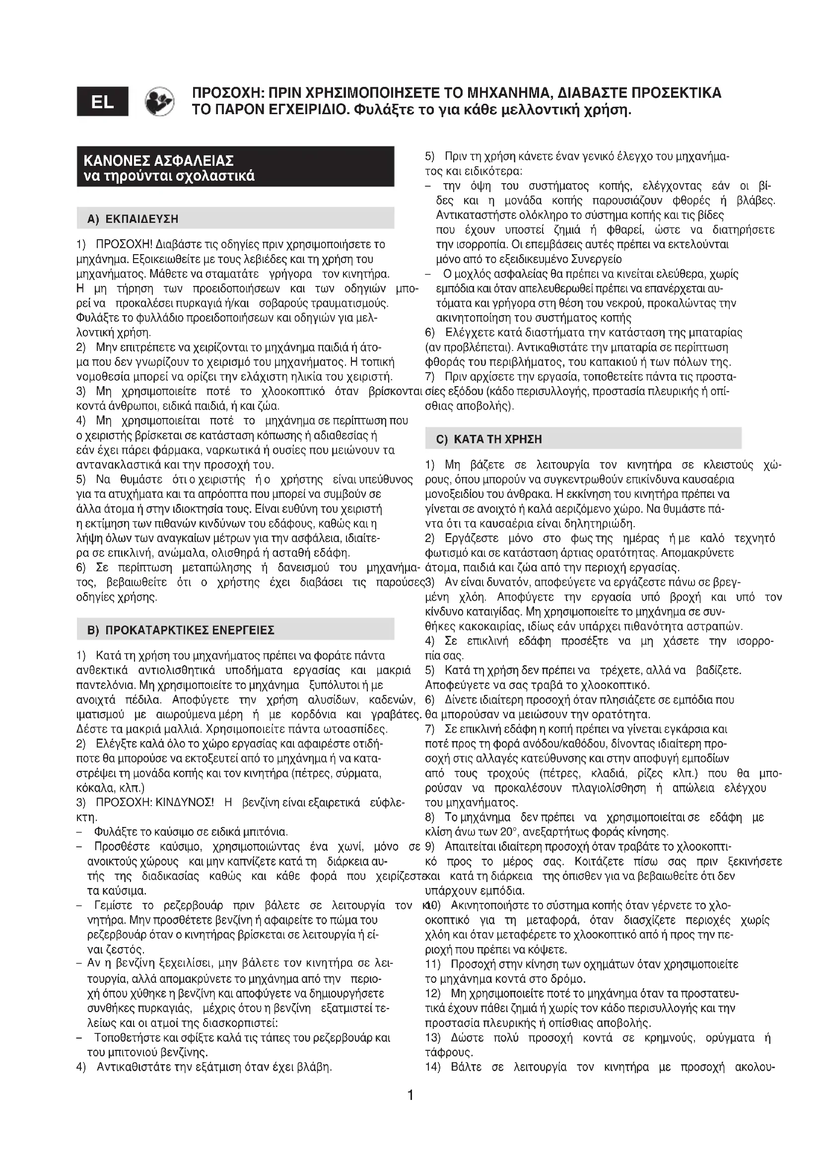 ΠΡΟΣΟΧΗ: ΠΡΙΝ ΧΡΗΣΙΜΟΠΟΙΗΣΕΤΕ ΤΟ ΜΗΧΑΝΗΜΑ, ΔΙΑΒΑΣΤΕ ΠΡΟΣΕΚΤΙΚΑ ΤΟ ΠΑΡΟΝ ΕΓΧΕΙΡΙΔΙΟ. Φυλάξτε το για κάθε μελλοντική χρήση. 5) Πριν τη χρήση κάνετε έναν γενικό έλεγχο του μηχανήμα- τος και ειδικότερα: – την όψη του συστήματος κοπής, ελέγχοντας εάν οι βί- δες και η μονάδα κοπής παρουσιάζουν φθορές ή βλάβες. Αντικαταστήστε ολόκληρο το σύστημα κοπής και τις βίδες που έχουν υποστεί ζημιά ή φθαρεί, ώστε να διατηρήσετε την ισορροπία. Οι επεμβάσεις αυτές πρέπει να εκτελούνται μόνο από το εξειδικευμένο Συνεργείο – Ο μοχλός ασφαλείας θα πρέπει να κινείται ελεύθερα, χωρίς εμπόδια και όταν απελευθερωθεί πρέπει να επανέρχεται αυ- τόματα και γρήγορα στη θέση του νεκρού, προκαλώντας την ακινητοποίηση του συστήματος κοπής 6) Ελέγχετε κατά διαστήματα την κατάσταση της μπαταρίας (αν προβλέπεται). Αντικαθιστάτε την μπαταρία σε περίπτωση φθοράς του περιβλήματος, του καπακιού ή των πόλων της. 7) Πριν αρχίσετε την εργασία, τοποθετείτε πάντα τις προστα- σίες εξόδου (κάδο περισυλλογής, προστασία πλευρικής ή οπί- σθιας αποβολής). C) ΚΑΤΑ ΤΗ ΧΡΗΣΗ 1) Μη βάζετε σε λειτουργία τον κινητήρα σε κλειστούς χώ- ρους, όπου μπορούν να συγκεντρωθούν επικίνδυνα καυσαέρια μονοξειδίου του άνθρακα. Η εκκίνηση του κινητήρα πρέπει να γίνεται σε ανοιχτό ή καλά αεριζόμενο χώρο. Να θυμάστε πά- ντα ότι τα καυσαέρια είναι δηλητηριώδη. 2) Εργάζεστε μόνο στο φως της ημέρας ή με καλό τεχνητό φωτισμό και σε κατάσταση άρτιας ορατότητας. Απομακρύνετε άτομα, παιδιά και ζώα από την περιοχή εργασίας. 3) Αν είναι δυνατόν, αποφεύγετε να εργάζεστε πάνω σε βρεγ- μένη χλόη. Αποφύγετε την εργασία υπό βροχή και υπό τον κίνδυνο καταιγίδας. Μη χρησιμοποιείτε το μηχάνημα σε συν- θήκες κακοκαιρίας, ιδίως εάν υπάρχει πιθανότητα αστραπών. 4) Σε επικλινή εδάφη προσέξτε να μη χάσετε την ισορρο-
