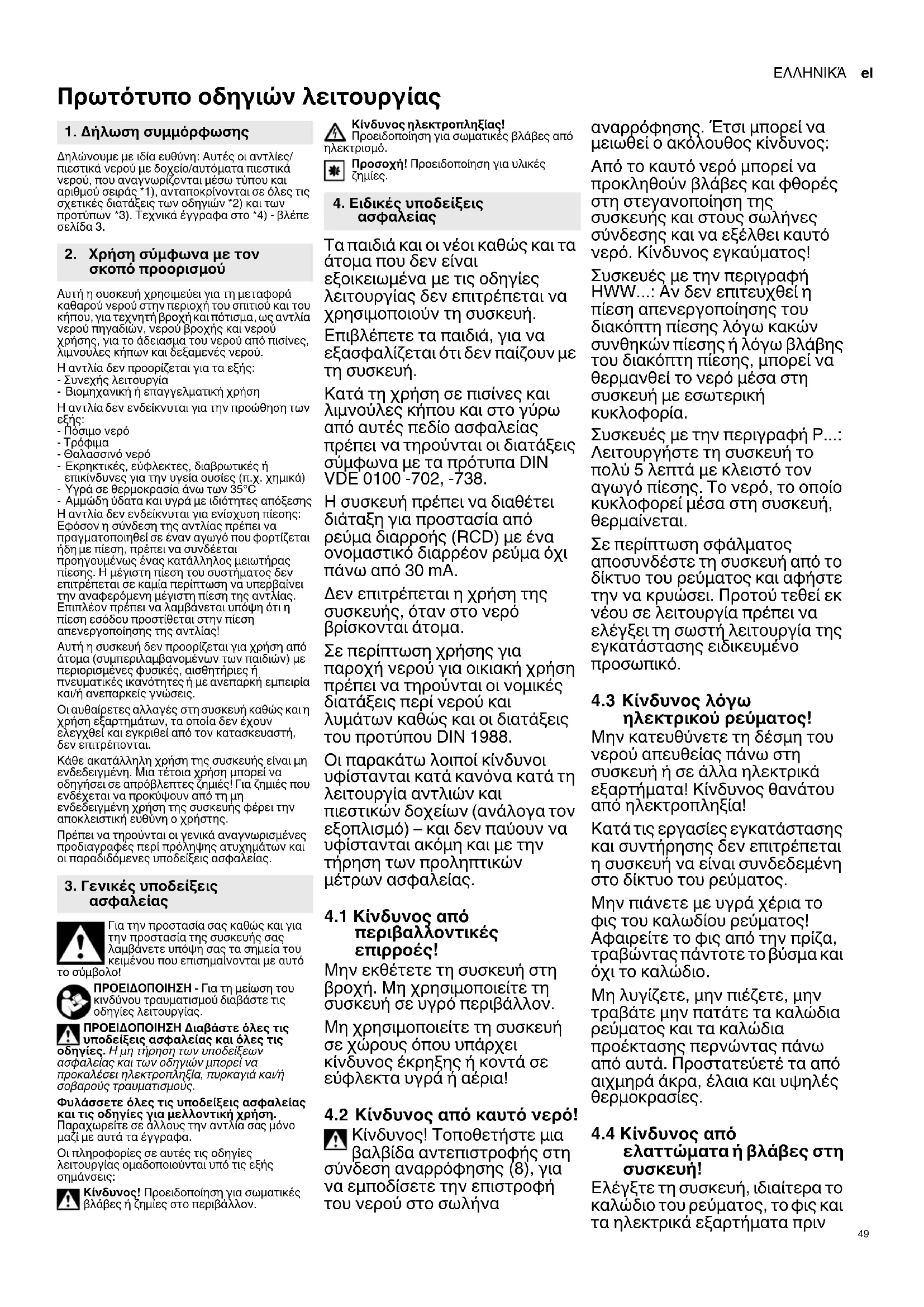 διατάξεις περί νερού και λυμάτων καθώς και οι διατάξεις του προτύπου DIN 1988. Οι παρακάτω λοιποί κίνδυνοι υφίστανται κατά κανόνα κατά τη λειτουργία αντλιών και πιεστικών δοχείων (ανάλογα τον εξοπλισμό) – και δεν παύουν να υφίστανται ακόμη και με την τήρηση των προληπτικών μέτρων ασφαλείας.