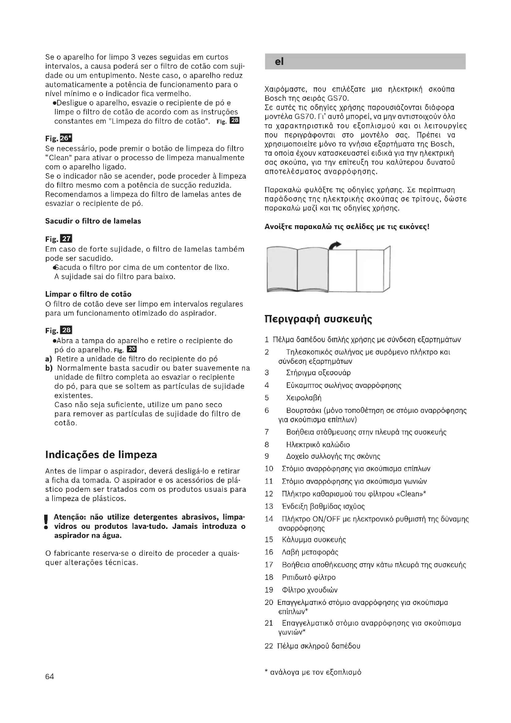 Atenção: não utilize detergentes abrasivos, limpa- vidros ou produtos lava-tudo. Jamais introduza o aspirador na água. O fabricante reserva-se o direito de proceder a quais- quer alterações técnicas. Χαιρόμαστε, που επιλέξατε μια ηλεκτρική σκούπα Bosch της σειράς GS70. Σε αυτές τις οδηγίες χρήσης παρουσιάζονται διάφορα μοντέλα GS70. Γι’ αυτό μπορεί, να μην αντιστοιχούν όλα τα χαρακτηριστικά του εξοπλισμού και οι λειτουργίες που περιγράφονται στο μοντέλο σας. Πρέπει να χρησιμοποιείτε μόνο τα γνήσια εξαρτήματα της Bosch, τα οποία έχουν κατασκευαστεί ειδικά για την ηλεκτρική σας σκούπα, για την επίτευξη του καλύτερου δυνατού αποτελέσματος αναρρόφησης. Παρακαλώ φυλάξτε τις οδηγίες χρήσης. Σε περίπτωση παράδοσης της ηλεκτρικής σκούπας σε τρίτους, δώστε παρακαλώ μαζί και τις οδηγίες χρήσης. Ανοίξτε παρακαλώ τις σελίδες με τις εικόνες! Περιγραφή συσκευής 1 Πέλμα δαπέδου διπλής χρήσης με σύνδεση εξαρτημάτων 2 Τηλεσκοπικός σωλήνας με συρόμενο πλήκτρο και σύνδεση εξαρτημάτων 3 Στήριγμα αξεσουάρ 4 Εύκαμπτος σωλήνας αναρρόφησης 5 Χειρολαβή 6 Βουρτσάκι (μόνο τοποθέτηση σε στόμιο αναρρόφησης για σκούπισμα επίπλων) 7 Βοήθεια στάθμευσης στην πλευρά της συσκευής 8 Ηλεκτρικό καλώδιο 9 Δοχείο συλλογής της σκόνης 10 Στόμιο αναρρόφησης για σκούπισμα επίπλων 11 Στόμιο αναρρόφησης για σκούπισμα γωνιών 12 Πλήκτρο καθαρισμού του φίλτρου «Clean»* 13 Ένδειξη βαθμίδας ισχύος 14 Πλήκτρο ON/OFF με ηλεκτρονικό ρυθμιστή της δύναμης αναρρόφησης 15 Κάλυμμα συσκευής 16 Λαβή μεταφοράς 17 Βοήθεια αποθήκευσης στην κάτω πλευρά της συσκευής 18 Ριπιδωτό φίλτρο 19 Φίλτρο χνουδιών 20 Επαγγελματικό στόμιο αναρρόφησης για σκούπισμα