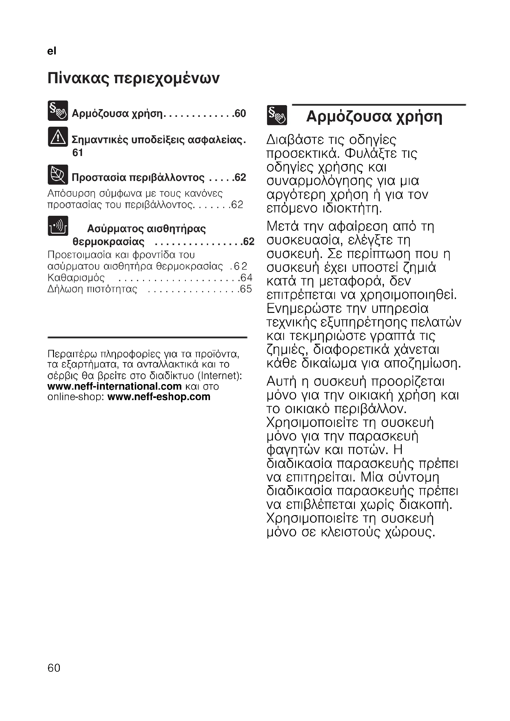 Πίνακας περιεχομένων elΟδηγíες χρήσης 8 Αρμόζουσα χρήση. . . . . . . . . . . . .60 ( Σημαντικές υποδείξεις ασφαλείας.