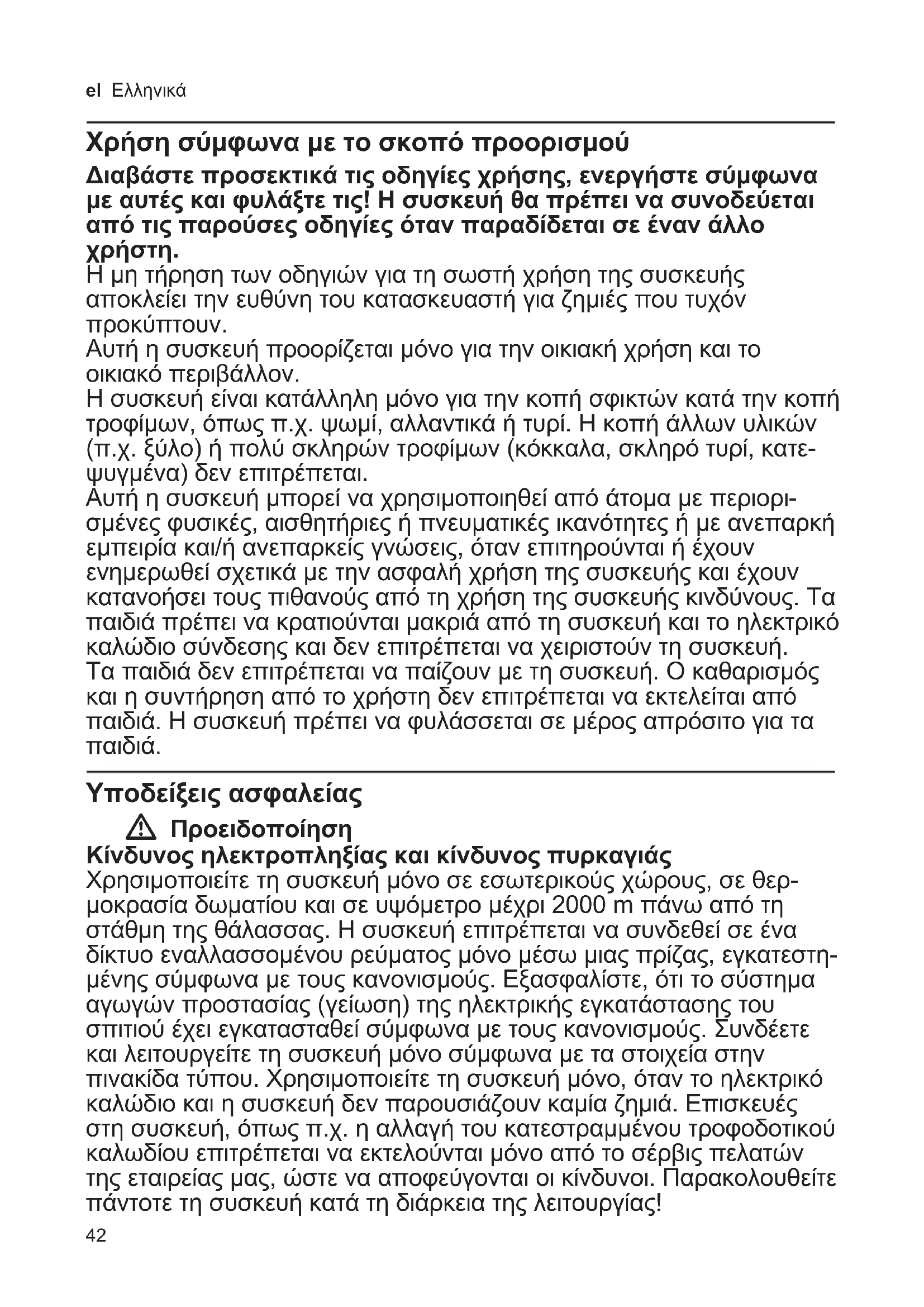 Η μη τήρηση των οδηγιών για τη σωστή χρήση της συσκευής αποκλείει την ευθύνη του κατασκευαστή για ζημιές που τυχόν προκύπτουν. Αυτή η συσκευή προορίζεται μόνο για την οικιακή χρήση και το οικιακό περιβάλλον. Η συσκευή είναι κατάλληλη μόνο για την κοπή σφικτών κατά την κοπή τροφίμων, όπως π.χ. ψωμί, αλλαντικά ή τυρί. Η κοπή άλλων υλικών (π.χ. ξύλο) ή πολύ σκληρών τροφίμων (κόκκαλα, σκληρό τυρί, κατε- ψυγμένα) δεν επιτρέπεται. Αυτή η συσκευή μπορεί να χρησιμοποιηθεί από άτομα με περιορι- σμένες φυσικές, αισθητήριες ή πνευματικές ικανότητες ή με ανεπαρκή εμπειρία και/ή ανεπαρκείς γνώσεις, όταν επιτηρούνται ή έχουν ενημερωθεί σχετικά με την ασφαλή χρήση της συσκευής και έχουν κατανοήσει τους πιθανούς από τη χρήση της συσκευής κινδύνους. Τα παιδιά πρέπει να κρατιούνται μακριά από τη συσκευή και το ηλεκτρικό καλώδιο σύνδεσης και δεν επιτρέπεται να χειριστούν τη συσκευή. Τα παιδιά δεν επιτρέπεται να παίζουν με τη συσκευή. Ο καθαρισμός και η συντήρηση από το χρήστη δεν επιτρέπεται να εκτελείται από παιδιά. Η συσκευή πρέπει να φυλάσσεται σε μέρος απρόσιτο για τα