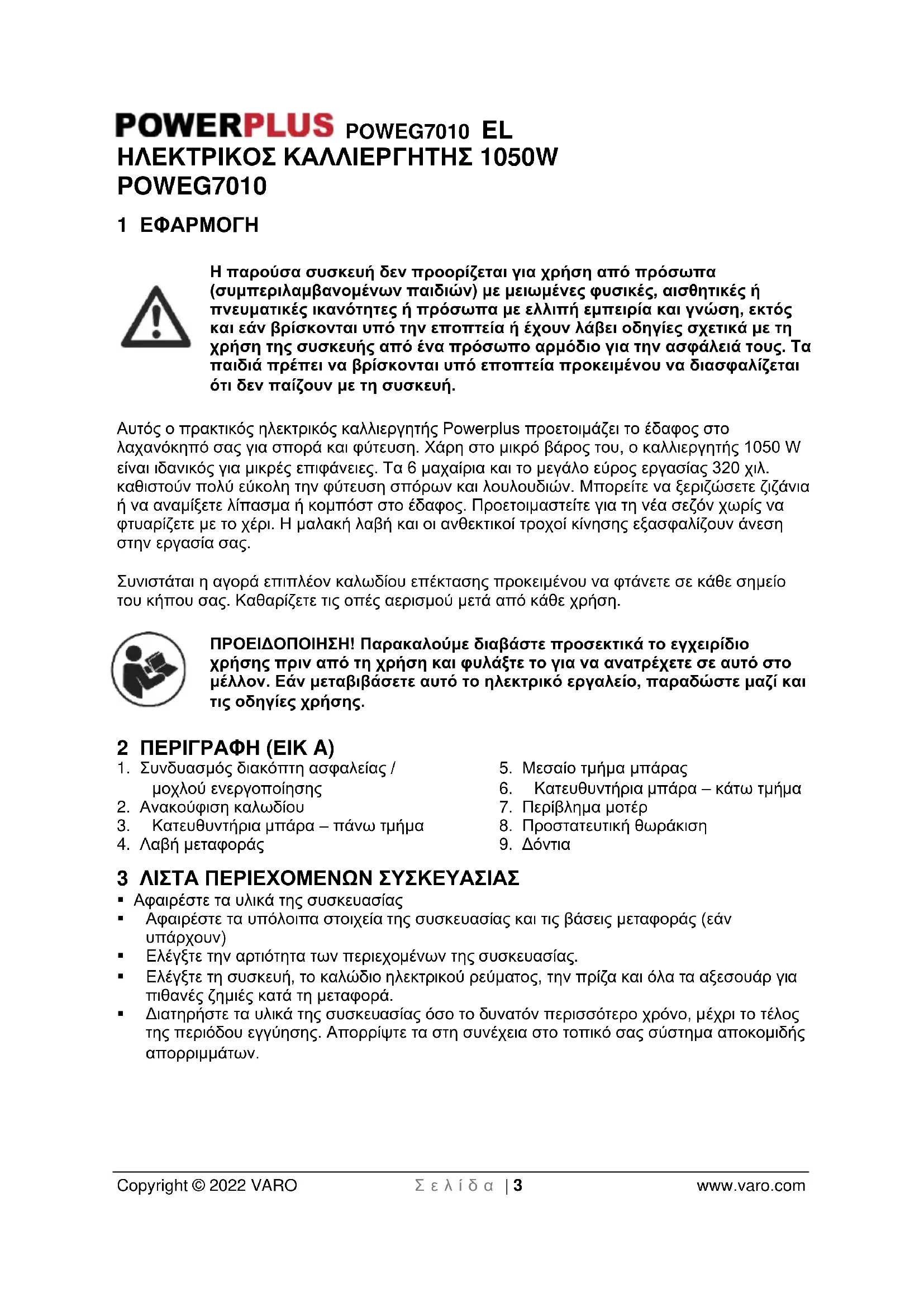 - Φροντίστε ώστε η συσκευή σας να επισκευάζεται μόνο από εξειδικευμένο τεχνικό προσωπικό και μόνο με γνήσια ανταλλακτικά. Έτσι θα διασφαλίζεται η διατήρηση της ασφαλούς λειτουργίας της συσκευής.POWEG7010 EL Copyright © 2022 VARO Σ ε λ ί δ α | 7 www.varo.com 6 ΣΥΜΠΛΗΡΩΜΑΤΙΚΕΣ ΠΡΟΕΙΔΟΠΟΙΗΣΕΙΣ ΑΣΦΑΛΕΙΑΣ ΓΙΑ ΚΑΛΛΙΕΡΓΗΤΕΣ