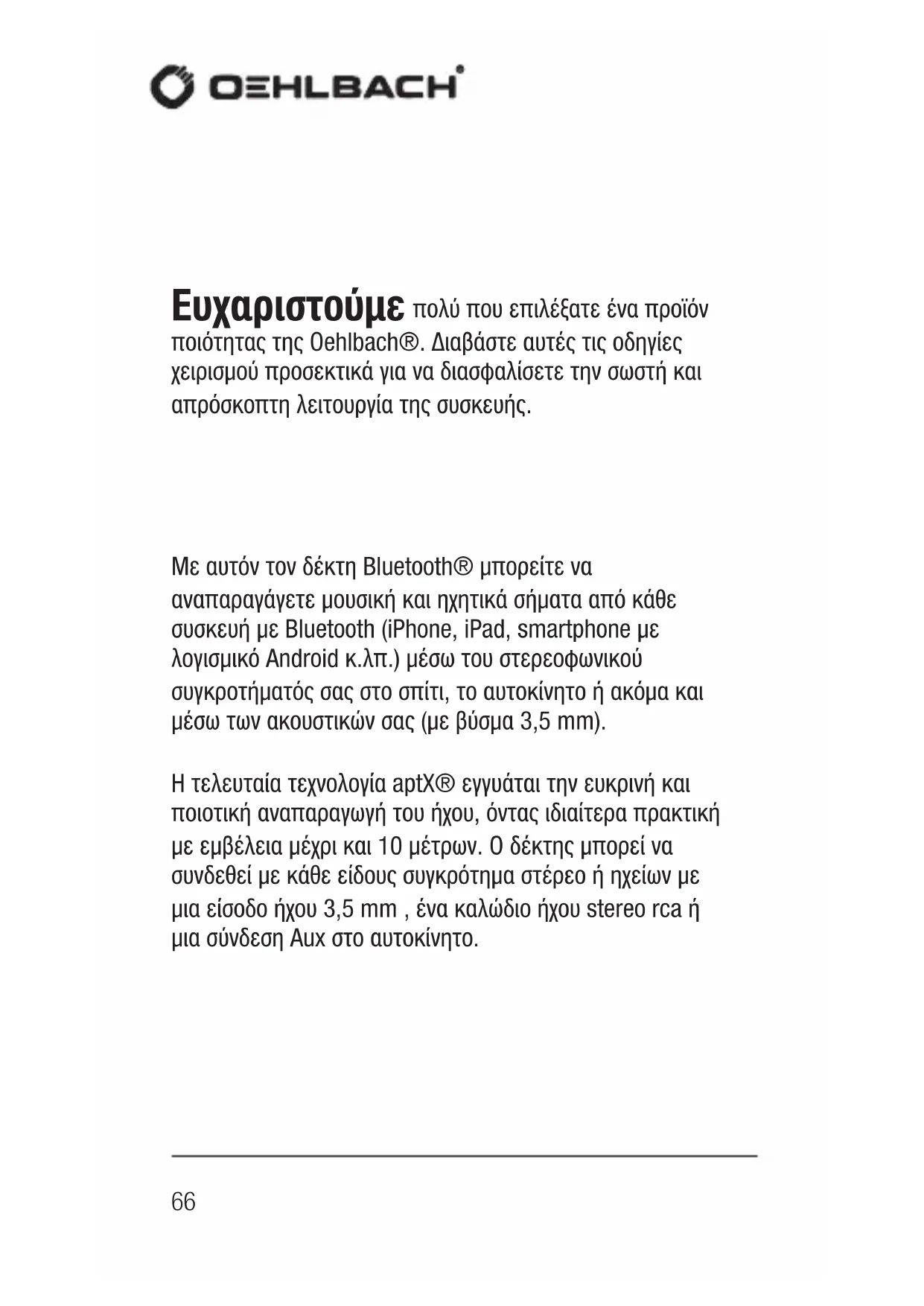- zwrot kosztów usuwania szkody przez osoby trzecie bez naszej uprzedniej zgody.66 Ευχαριστούμε πολύ που επιλέξατε ένα προϊόν ποιότητας της Oehlbach®. Διαβάστε αυτές τις οδηγίες χειρισμού προσεκτικά για να διασφαλίσετε την σωστή και απρόσκοπτη λειτουργία της συσκευής. Με αυτόν τον δέκτη Bluetooth® μπορείτε να αναπαραγάγετε μουσική και ηχητικά σήματα από κάθε συσκευή με Bluetooth (iPhone, iPad, smartphone με λογισμικό Android κ.λπ.) μέσω του στερεοφωνικού συγκροτήματός σας στο σπίτι, το αυτοκίνητο ή ακόμα και μέσω των ακουστικών σας (με βύσμα 3,5 mm). Η τελευταία τεχνολογία aptX® εγγυάται την ευκρινή και ποιοτική αναπαραγωγή του ήχου, όντας ιδιαίτερα πρακτική με εμβέλεια μέχρι και 10 μέτρων. Ο δέκτης μπορεί να συνδεθεί με κάθε είδους συγκρότημα στέρεο ή ηχείων με μια είσοδο ήχου 3,5 mm , ένα καλώδιο ήχου stereo rca ή μια σύνδεση Aux στο αυτοκίνητο.67 GRE BTX 1000 Λειτουργίες ∙ Streaming ήχου από κάθε συσκευή Bluetooth® ∙ Ήχος υψηλής ποιότητας Bluetooth με την υποστήριξη της τεχνολογίας aptX® ∙ Φορμάτ ήχου μέχρι 44,1 kHz συχνότητα δειγματοληψίας και 16 bit ανάλυση σήματος (ποιότητα CD) ∙ Συμβατό με Bluetooth 4.0 ∙ Μέχρι και 10 ώρες μουσικής Προδιαγραφές Εμβέλεια: μέχρι και 10 μέτρα Ρυθμός μετάδοσης: μέχρι και 352kbps Διάρκεια μπαταρίας: μέχρι και 10 ώρες Συχνότητα δειγματοληψίας: 10Hz μέχρι 22kHz ύρος θερμοκρασίας: -15 έως +50 °C Επιτρεπόμενη σχετική υγρασία αέρα: 5 έως 90 % Διαστάσεις (Π x Υ x Β): 28 x 16 x 78 mm Περιεχόμενα συσκευασίας: ∙ Δέκτης ήχου Bluetooth BTX1000 της Oehlbach ∙ Καλώδιο USB-A σε micro USB ∙ Βύσμα 3,5mm σε αντάπτορα stereo rca ∙ Οδηγίες χρήσης68