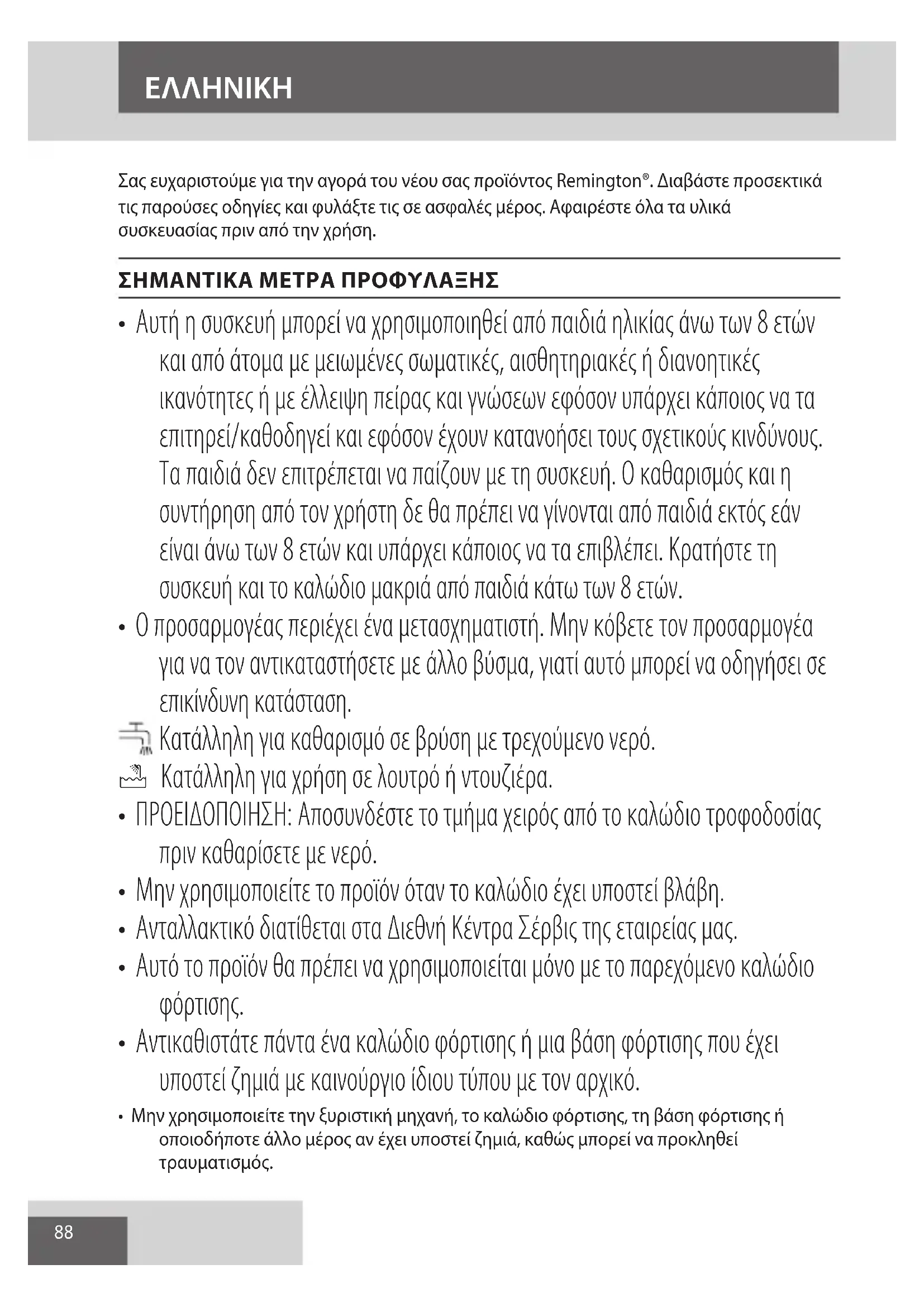 Για την αποφυγή προβλημάτων στο περιβάλλον και την υγεία λόγω επιβλαβών ουσιών, οι συσκευές και οι επαναφορτιζόμενες και μη επαναφορτιζόμενες μπαταρίες που επισημαίνονται με κάποιο από αυτά τα σύμβολα, δεν πρέπει να απορρίπτονται με τα κοινά οικιακά απορρίμματα. Να απορρίπτετε πάντα τις ηλεκτρικές και ηλεκτρονικές συσκευές και, όπου χρειάζεται, τις επαναφορτιζόμενες και μη επαναφορτιζόμενες μπαταρίες, σε κατάλληλο, επίσημο σημείο συλλογής/ανακύκλωσης.93 Zahvaljujemo se vam za nakup novega izdelka Remington®. Prosimo, da skrbno preberete ta navodila in jih varno shranite. Pred uporabo odstranite vso embalažo.OPOZORILO: Ta naprava je vroča. Vedno naj bo nedosegljiva otrokom.