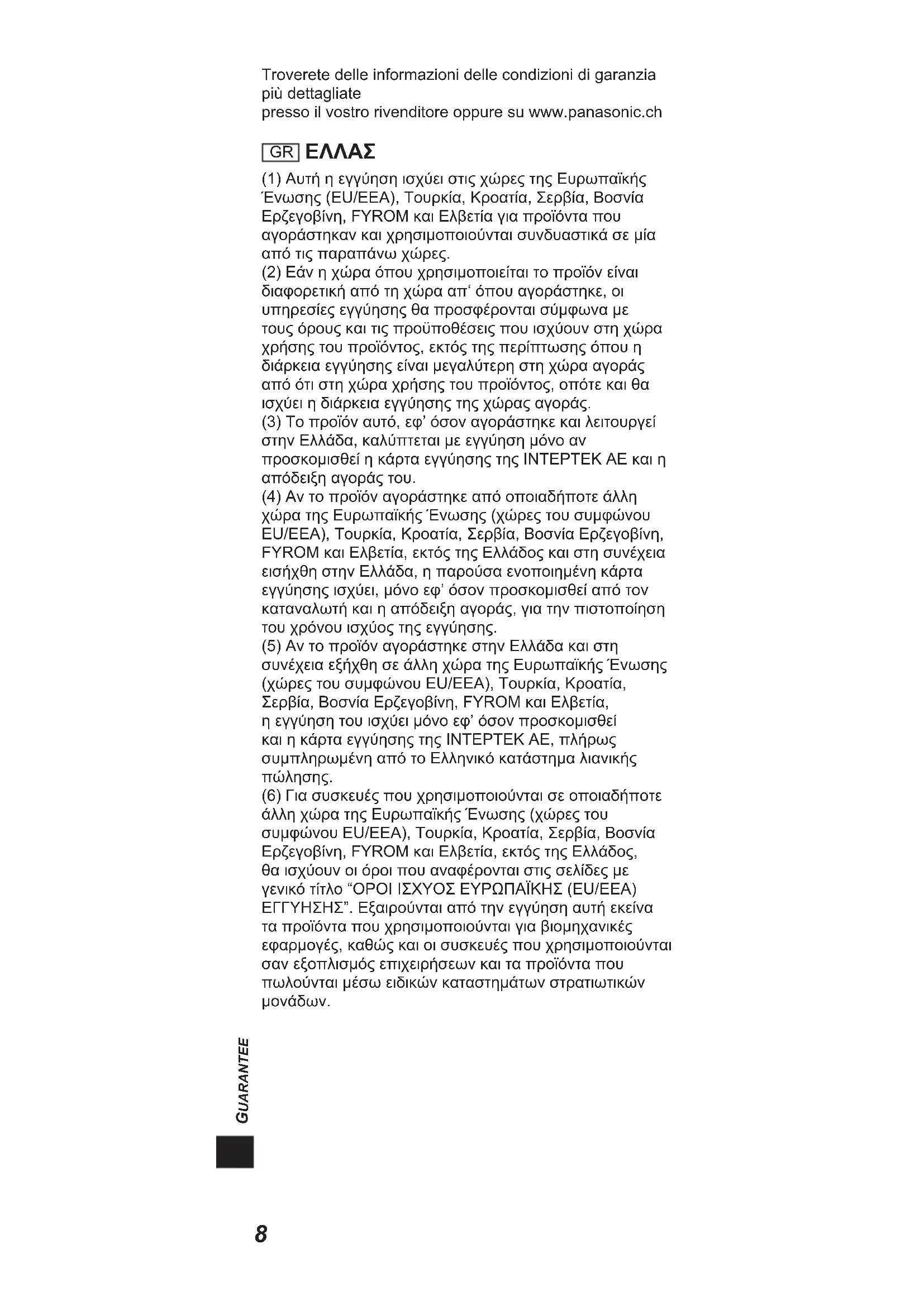 (6) Για συσκευές που χρησιμοποιούνται σε οποιαδήποτε άλλη χώρα της Ευρωπαϊκής Ένωσης (χώρες του συμφώνου ΕU/ΕΕΑ), Τουρκία, Κροατία, Σερβία, Βοσνία Ερζεγοβίνη, FYROM και Ελβετία, εκτός της Ελλάδος, θα ισχύουν οι όροι που αναφέρονται στις σελίδες με γενικό τίτλο “ΟΡΟΙ ΙΣΧΥΟΣ ΕΥΡΩΠΑΪΚΗΣ (ΕU/ΕΕΑ) ΕΓΓΥΗΣΗΣ”. Εξαιρούνται από την εγγύηση αυτή εκείνα τα προϊόντα που χρησιμοποιούνται για βιομηχανικές εφαρμογές, καθώς και οι συσκευές που χρησιμοποιούνται σαν εξοπλισμός επιχειρήσεων και τα προϊόντα που πωλούνται μέσω ειδικών καταστημάτων στρατιωτικών μονάδων.G UARANTEE